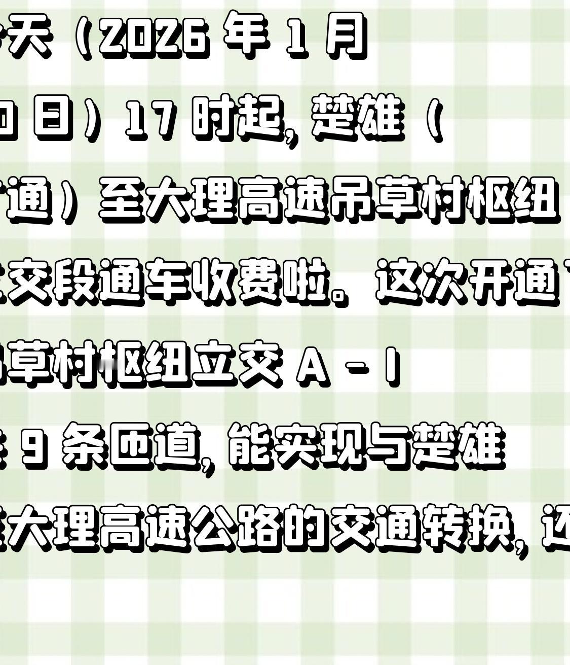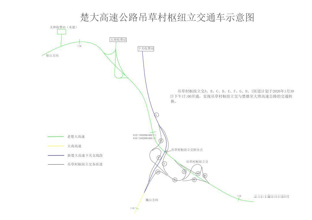 今天(2026 年 1 月 30 日)17 时起,楚雄(广通)至大理高速吊草村枢纽立交段通车收费啦。这次开通了吊草村枢纽立交 A - I 共 9 条匝道,能实现与楚雄至大理高速公路的交通转换,还没有新增计费里程。 收费标准方面,客车普通路段 0.50 元/车·公里,桥梁隧道段 1.40 元/车·公里;货车普通路段 0.45 元/车·公里,桥梁隧道段 1.15 元/车·公里;专项作业车按货车标准执行。这枢纽段开通对优化滇西高速网络、提升交通衔接效率有好处,要路过的朋友按标志标线走,注意安全。