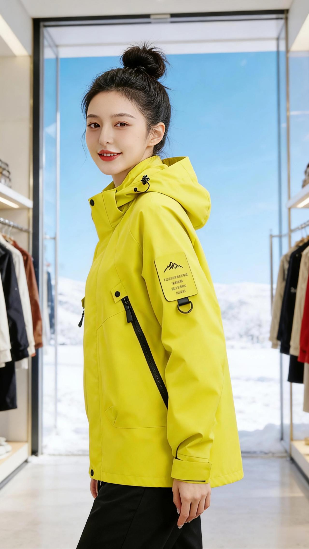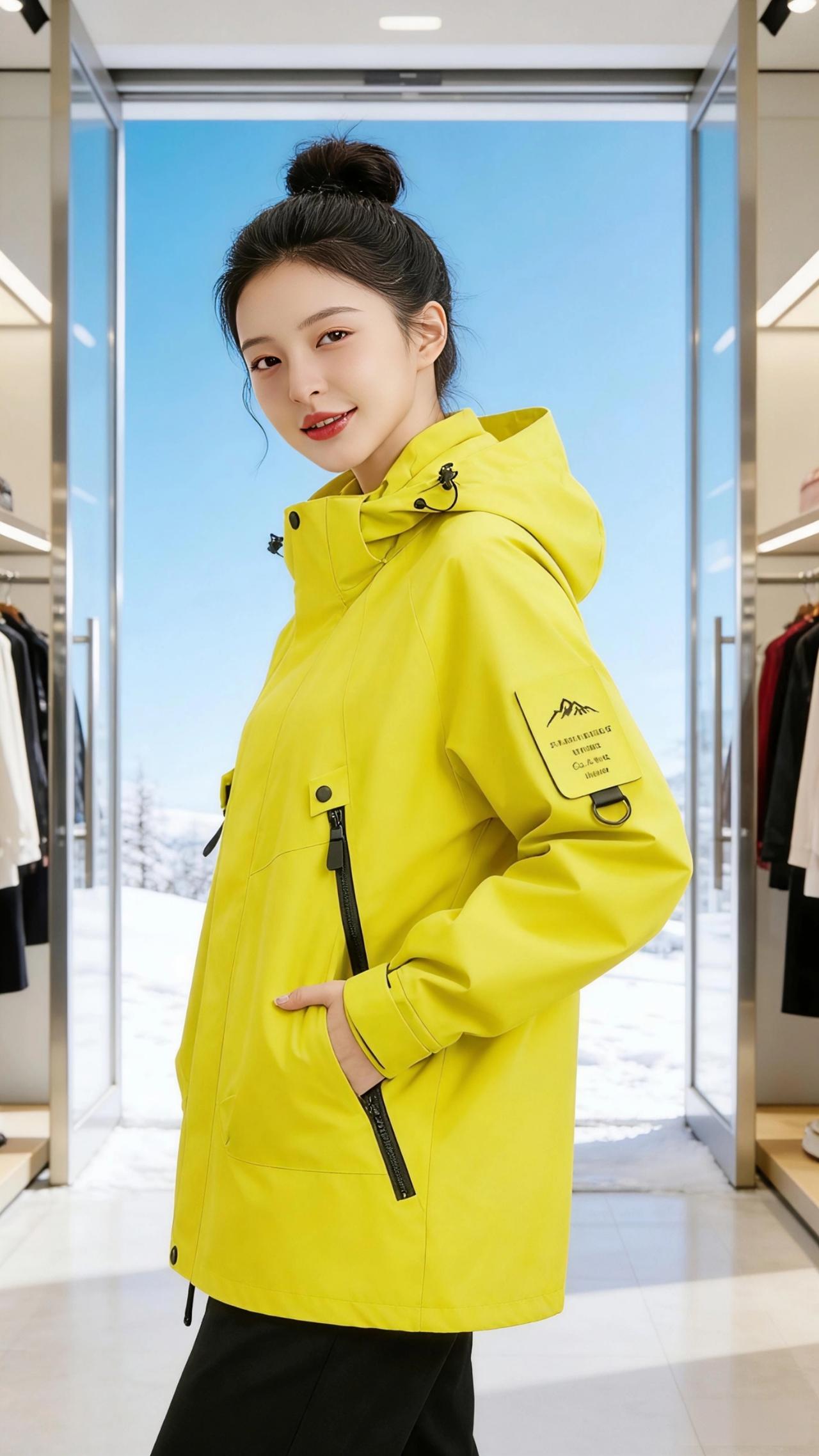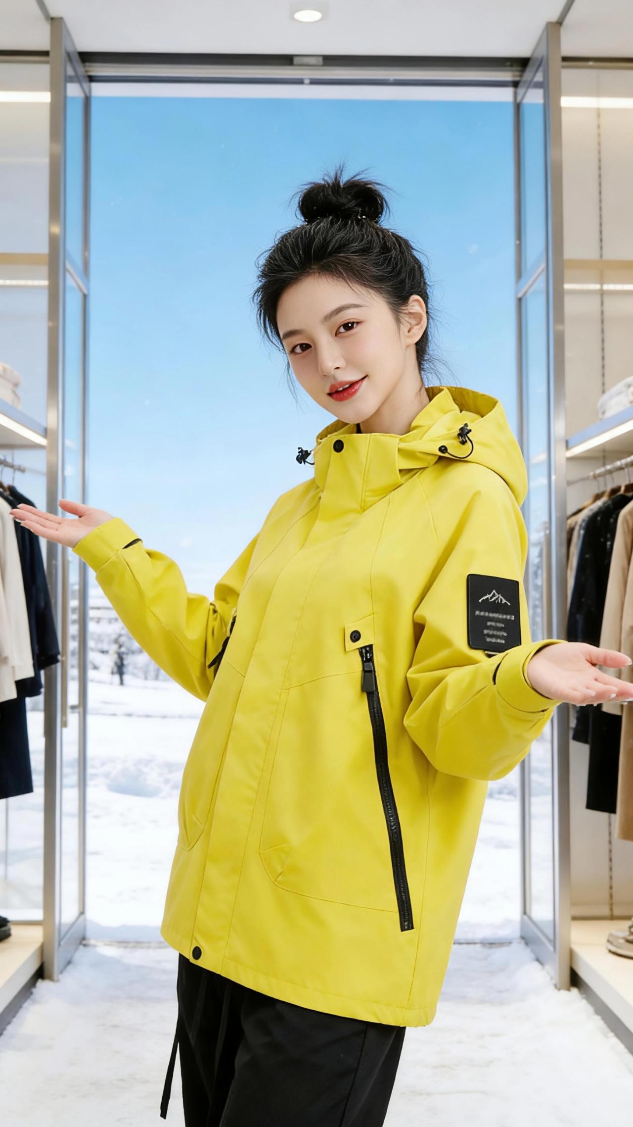 黄与雪的序章 雪落在临街店铺的白色檐角时,明黄色的冲锋衣撞进了冬日的留白里。 她站在店门前的雪地上,指尖轻捏着领口的袢扣,蓬松的衣料在风里鼓起柔软的弧度。玻璃门后挂着琳琅的衣衫,却都比不上这一抹鲜活的黄——像初春抽芽的柳,像檐角悬着的暖阳,把冷冽的冬气都焜得暖了些。 转身时衣摆扫过地面的碎雪,她伸手去够衣架上的外套,冲锋衣的拉链在光线下泛着细腻的黑。店内的暖光漫过肩头,与窗外的蓝天白雪撞出温柔的分界。她将手插进衣兜,侧头望向远处的雪山,明黄的衣身衬得眉眼愈发清润,仿佛这不是一件御寒的外套,而是写给冬天的一封明亮情书。 后来她张开双臂站在店门口,雪粒落在衣料上瞬间消融,就像所有沉闷的寒意,都会被这样鲜活的色彩轻轻接住。风穿过街道,带着雪的清冽与衣料的干爽,她的笑容落在明黄的衣肩上,成了这个冬日里最生动的注脚。 高级感穿搭
