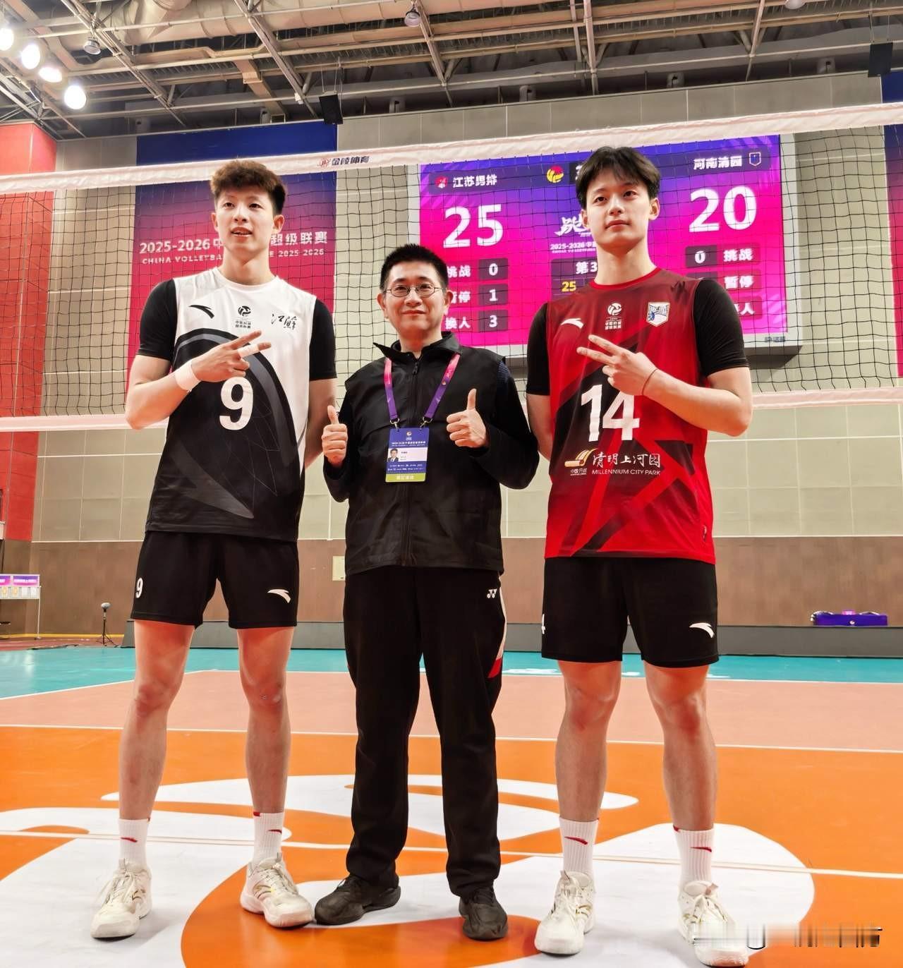 江苏男排对上河南男排,虽然两队强弱分明,比赛结果没悬念,但让两位当红排坛人气帅哥吴昊泽和杨家兴有机会同框,也是一大亮点。