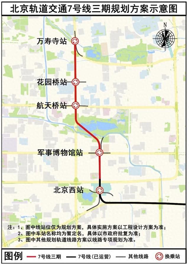 北京轨道交通7号线三期是国家发展和改革委批复的北京市轨道交通第三期建设规划项目之一,是既有7号线由北京西站向北的延伸线。线路起点北京西站(不含),终点万寿寺站,全部位于海淀区,串联北京西站、军事博物馆、万寿寺、航天桥等重点区域。项目的建设可改善沿线地区对外出行条件,提供大容量、公交化的轨道交通服务。