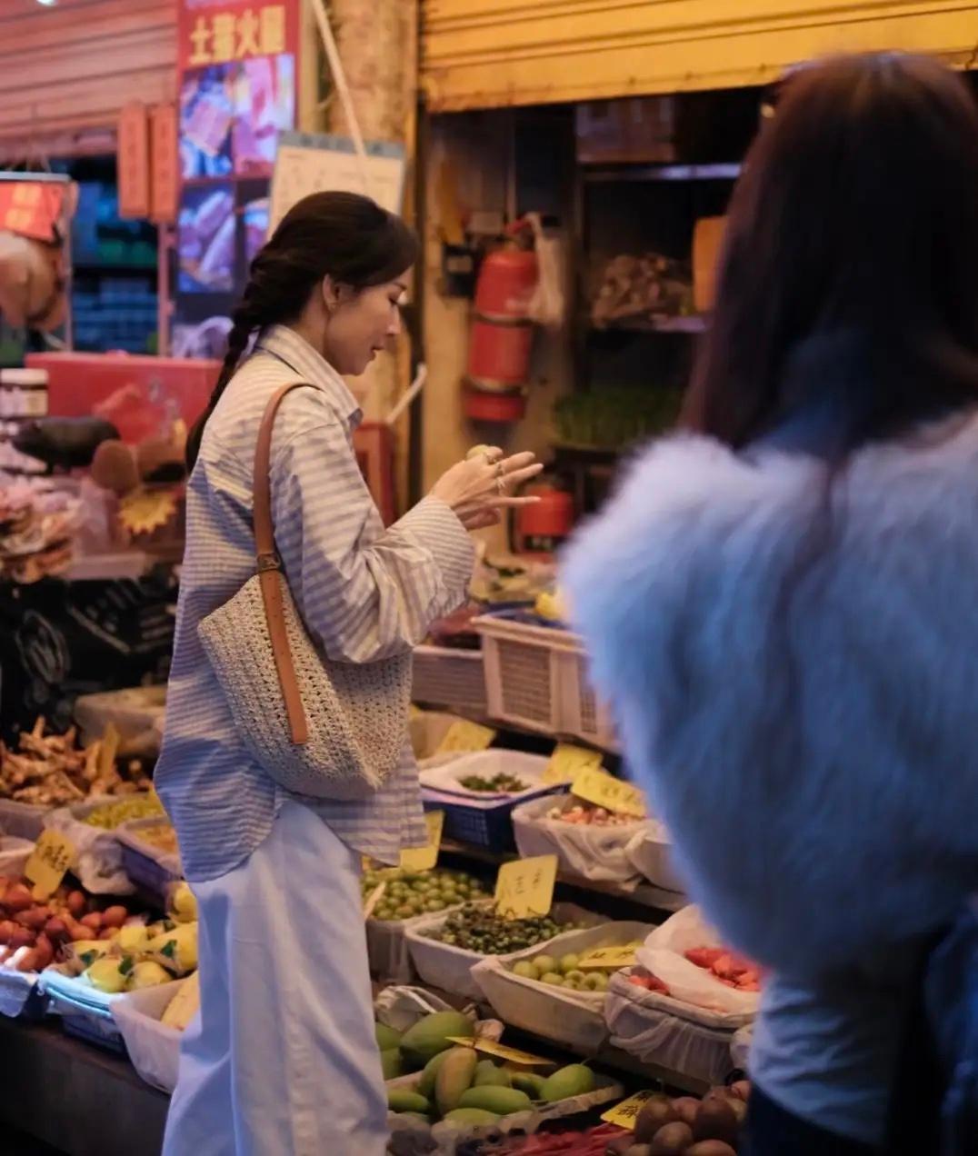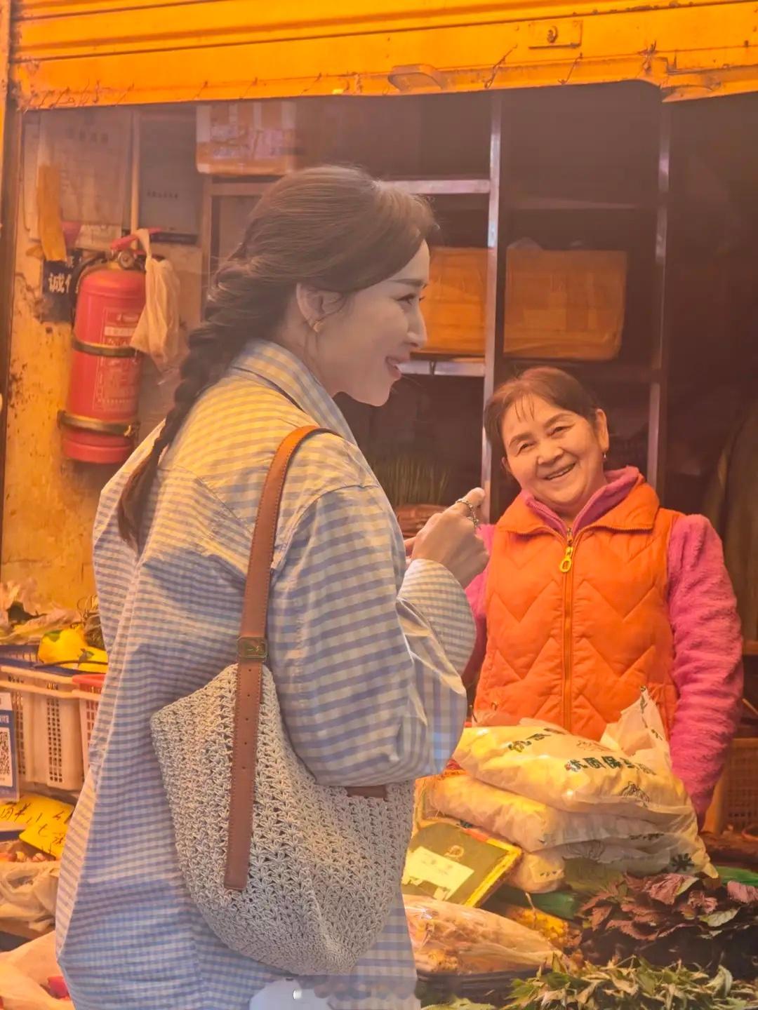 48岁胡静逛云南农贸市场,打扮朴素像村妇,站在路边吃米糕接地气!