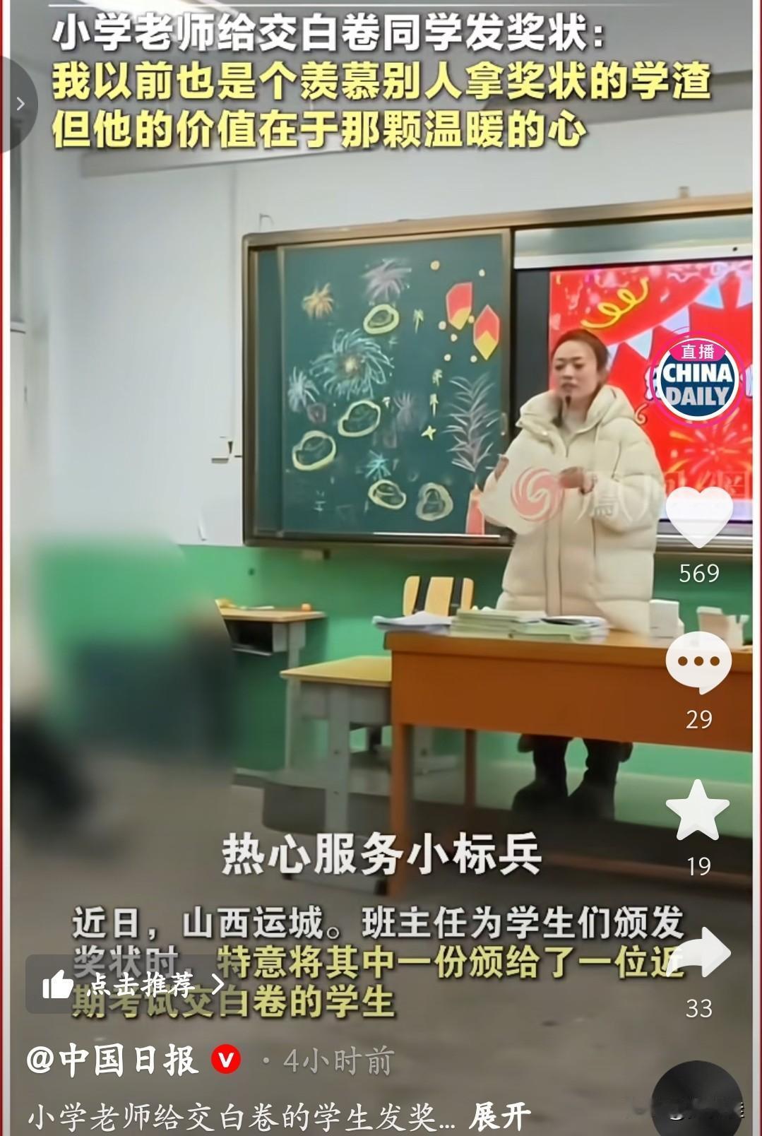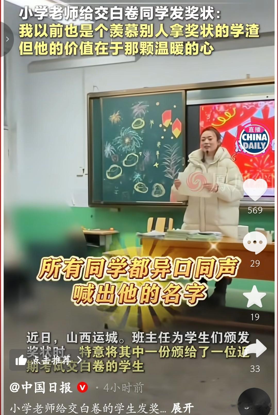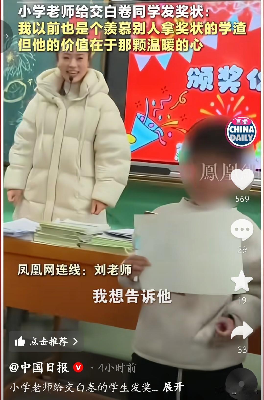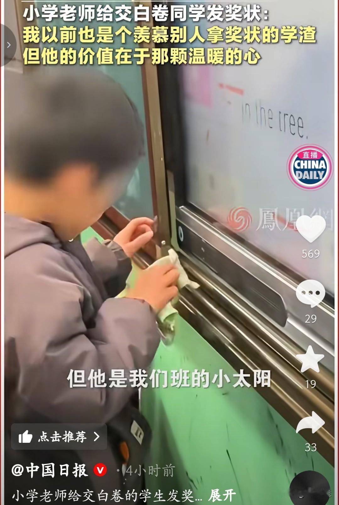 班级颁奖时,念到“最爱服务的热心小标兵”,全班同学竟异口同声喊出了那个总“交白卷”的孩子的名字。读者是不是很疑惑?老师给出了答案。 老师说,这个孩子因为家庭原因,打心底里抗拒学习。老师足足鼓励了三年,他的试卷上依旧空空如也。但他却是班里名副其实的小太阳,每天早早到校,乐呵呵地跟每位同学打招呼;老师需要帮忙,他第一个冲上前;同学遇到难处,他二话不说就伸手。 老师把奖状递给他时,认真告诉他:“你的价值,从来不在对错题和白卷里,而在这颗温暖待人的心里。” 这才是为人师表最该做的事—不抹杀孩子的闪光点,不用一把尺子丈量所有孩子。 老师没有多提孩子的家庭困境,只默默守护着他的自尊。多希望他能被这样的善意包裹,也盼着他的家人能多给些温暖,让他慢慢卸下防备,愿意靠近书本。