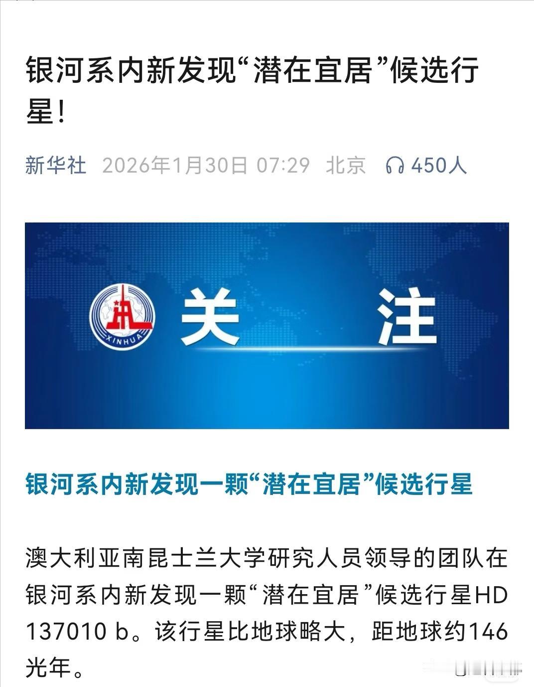 重大发现!银河系中找到地球“双胞胎? ”银河系又现新惊喜!澳南昆士兰大学团队发现一颗潜在宜居候选行星 HD 137010 b,距地球约 146 光年,比地球略大。 这颗行星或为岩石构成,绕类太阳恒星运行,处在恒星宜居带外缘,理论上可能存在液态水,具体则要看大气条件。 相关研究论文已发表于美国《天体物理学杂志通讯》。寻找地球 “双胞胎” 是科学家的目标,这颗行星仍需后续观测才能从候选转正。研究人员也提醒,潜在宜居不等于实际宜居,不过这一发现依旧极具吸引力。银河系中找到地球“双胞胎” 银河系重大发现