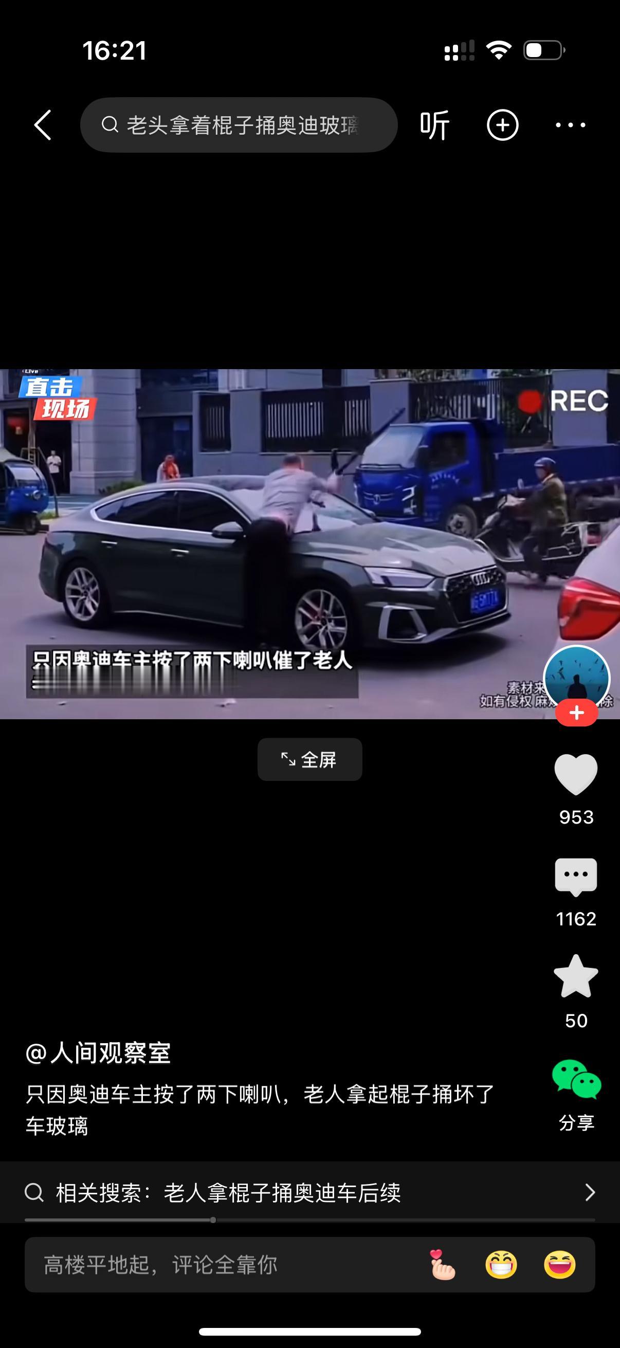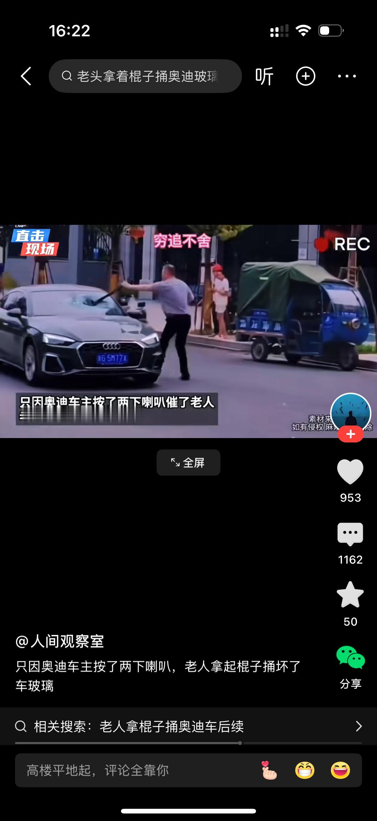 只因奥迪车司机按了两下喇叭催了老人。老人拿起棍子捅坏挡风玻璃。老人是真坏,他左边