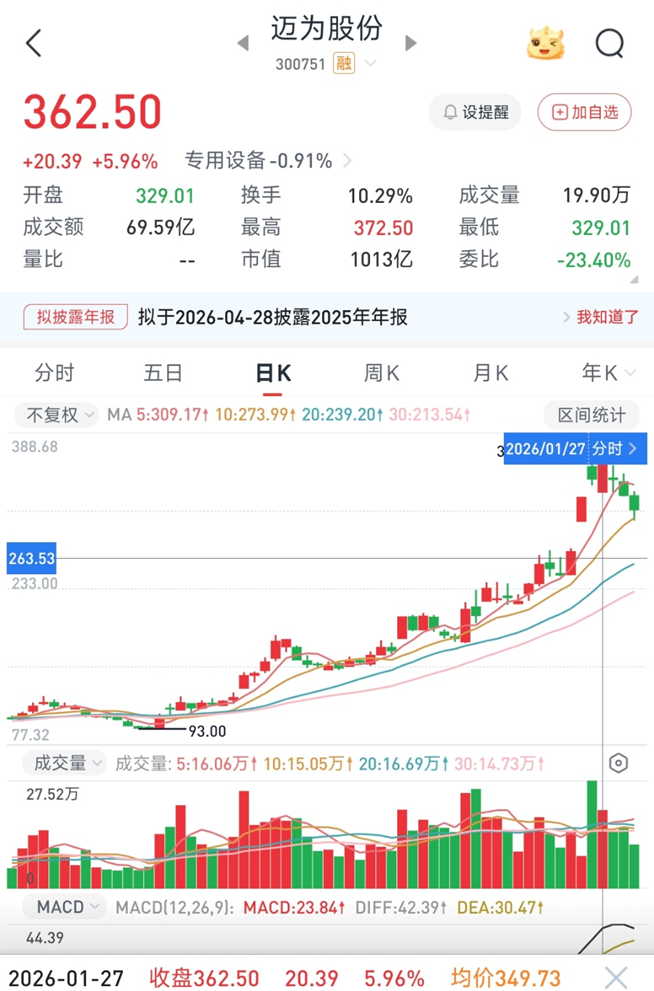 本周二,光伏HJT设备龙头迈为股份股价大涨5.96%,报收362.5元创历史新高,总市值正式突破千亿大关,达到1013亿元。