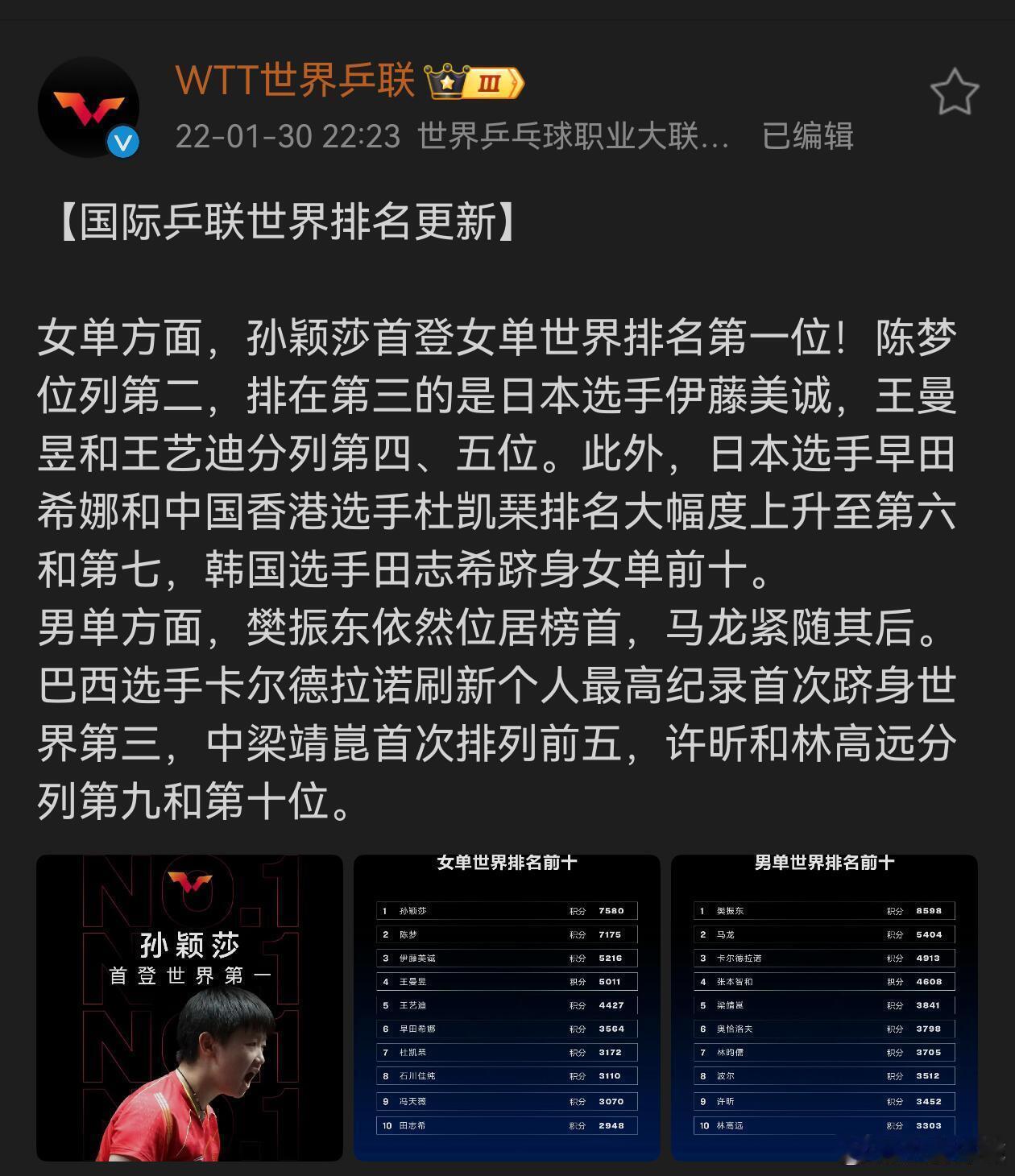 孙颖莎首登世界第一四周年纪念日 莎莎首登女单世界第一四年啦!2022年1月30日