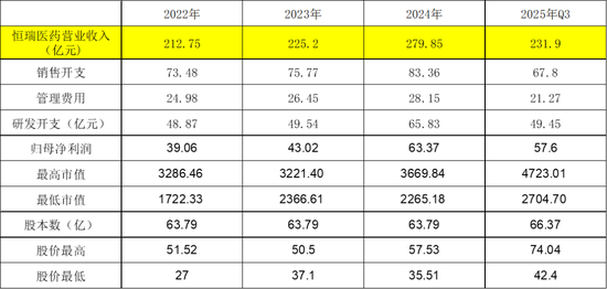 2025年前三季度,百济神州的营业收入已超过恒瑞医药的231.9亿元为275.95亿,但其2025年峰值市值只有3535.05亿港元,远低于恒瑞医药的4721亿人民币。