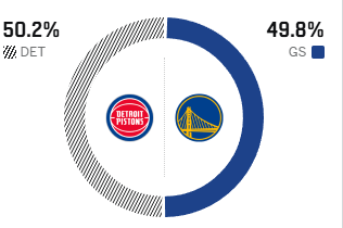 ESPN预测明日比赛胜率:勇士为49.8%,而活塞则为50.2%