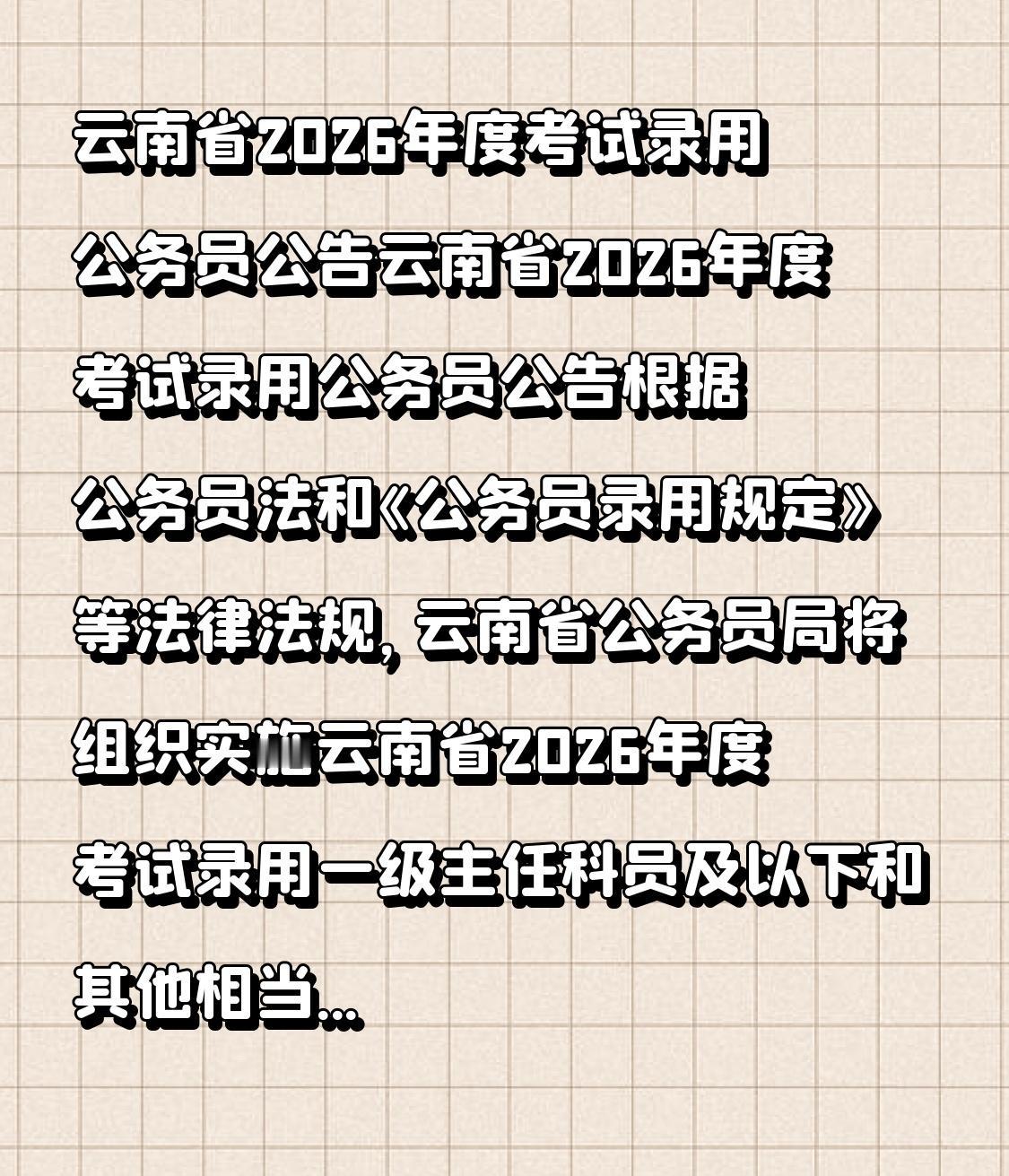 云南省2026年度考试录用公务员公告 根据公务员法和《公务员录用规定》等法律法规,云南省公务员局将组织开展云南省2026年度考试录用一级主任科员及以下和其他相当职级层次公务员工作。现将有关事项公告如下: 一、报考条件 报考者应具备下列资格条件: (一)具有中华人民共和国国籍; (二)年龄一般为18周岁以上、38周岁以下(1987年2月至2008年2月期间出生),2026年应届硕士研究生和博士研究生、乡(镇、街道)定向招录优秀村(社区)干部职位的报考者年龄可放宽到43周岁以下(1982年2月及以后出生); 云南公考 2026年云南省公务员考试(省考)普通考生年龄放宽至38岁,研究生43岁,应该也是首次! 云南选调生 云南公务员考试 云南公考 云南公考资讯 公务员 考试