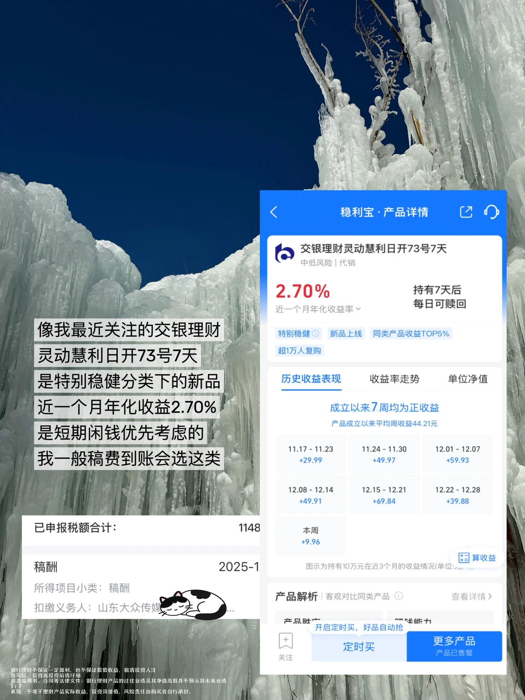 像我最近关注的交银73号,是特别稳健分类下的新品,近一个月年化收益能到2.7%,成立以来7周都是正收益,胜在稳定,是短期闲钱优先考虑的,今年年终奖我考虑放在这里。