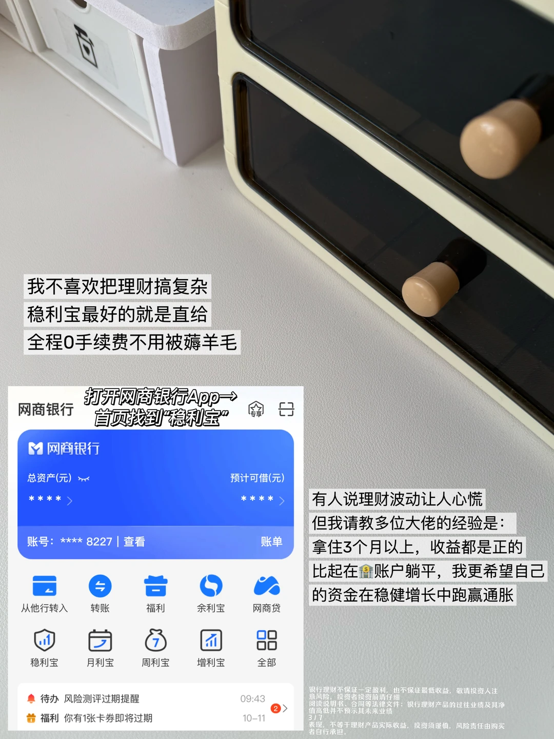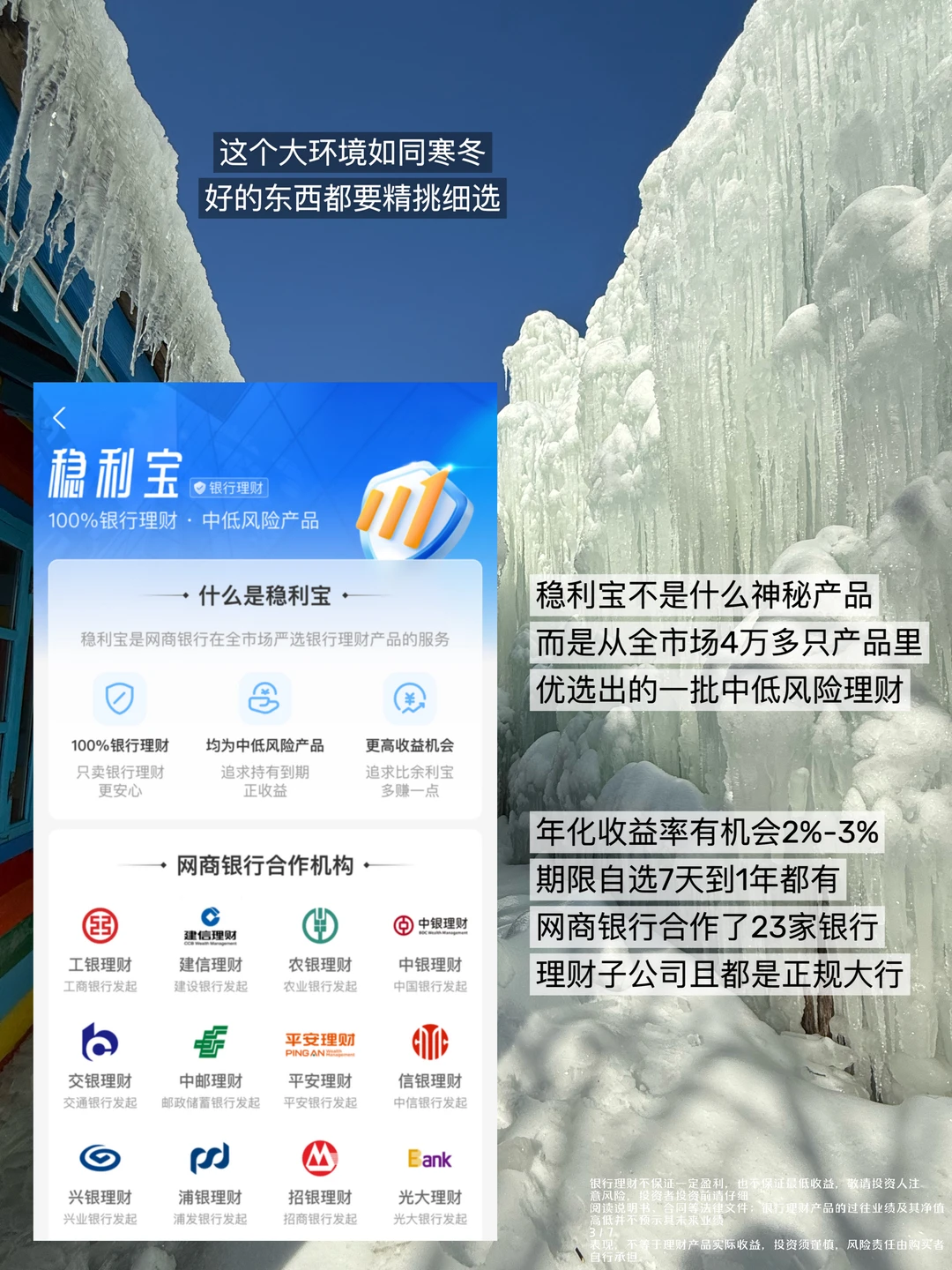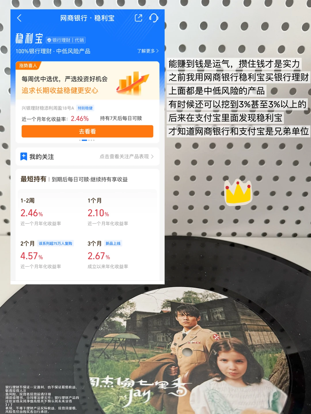 之前我也分享过,我用网商银行稳利宝买银行理财,上面都是中低风险的产品,且有时能挖到3%甚至3%以上的。我是在支付宝里面发现稳利宝的,他俩是兄弟单位,还挺方便的。