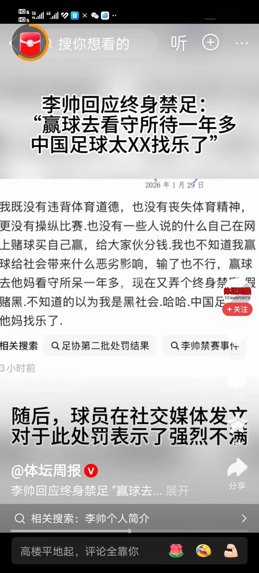 被禁足球员李帅发文:赢球去看守所,中国足球太找乐!意思是自己喊冤被禁足,坐牢一年多还背黑锅,中国足球谁信谁倒霉