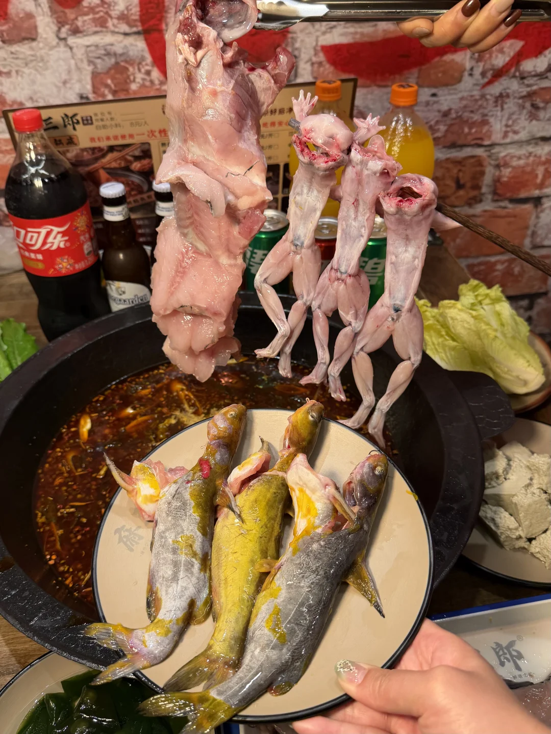 蕞绝的是上桌后的淋热油环节!滚烫的菜籽油“刺啦”一声浇在铺满辣椒花椒的锅面,香气直接冲到天灵盖,瞬间激活所有鲜味,这才是鱼蛙火锅的灵魂仪式感啊🔥