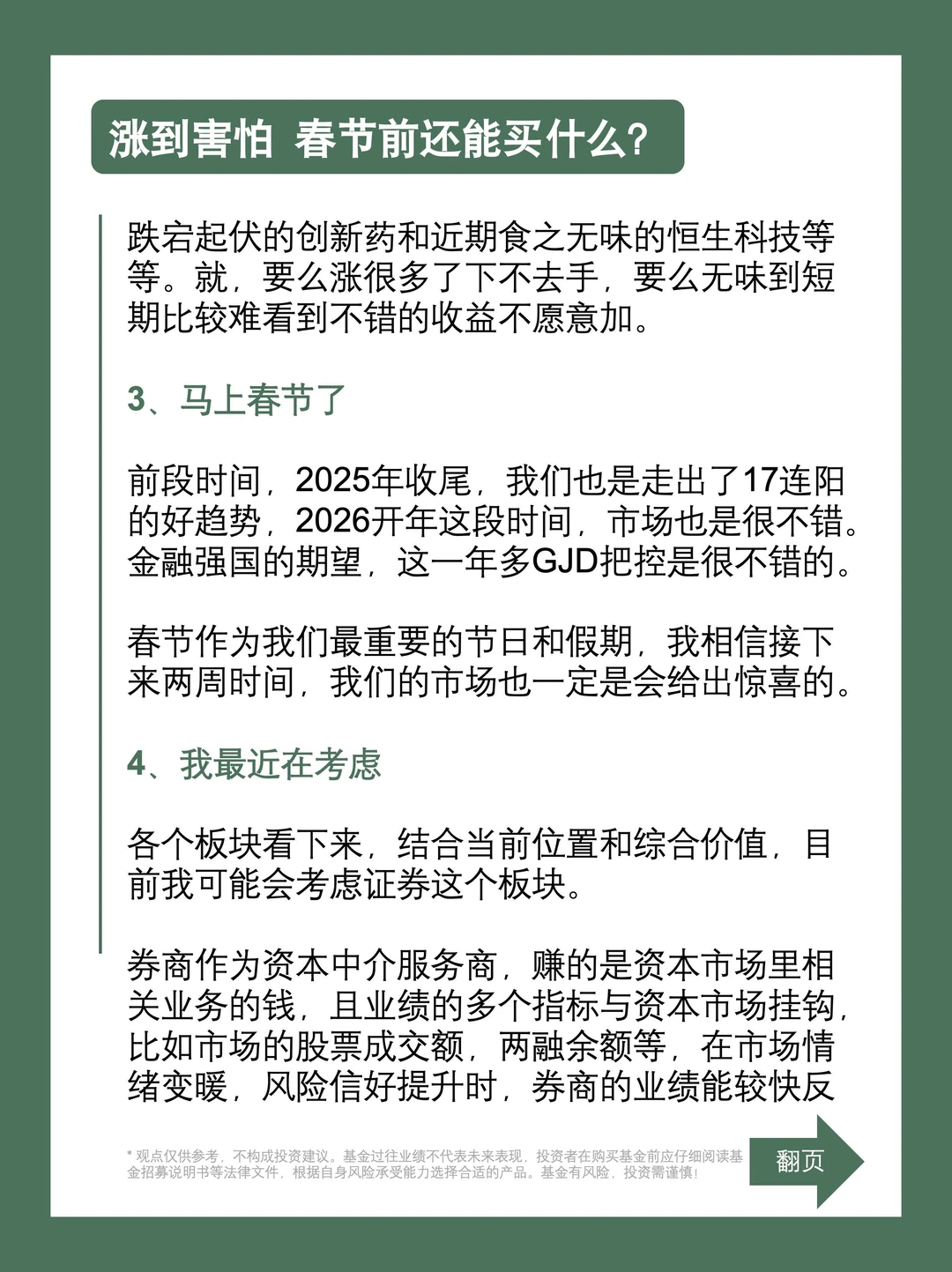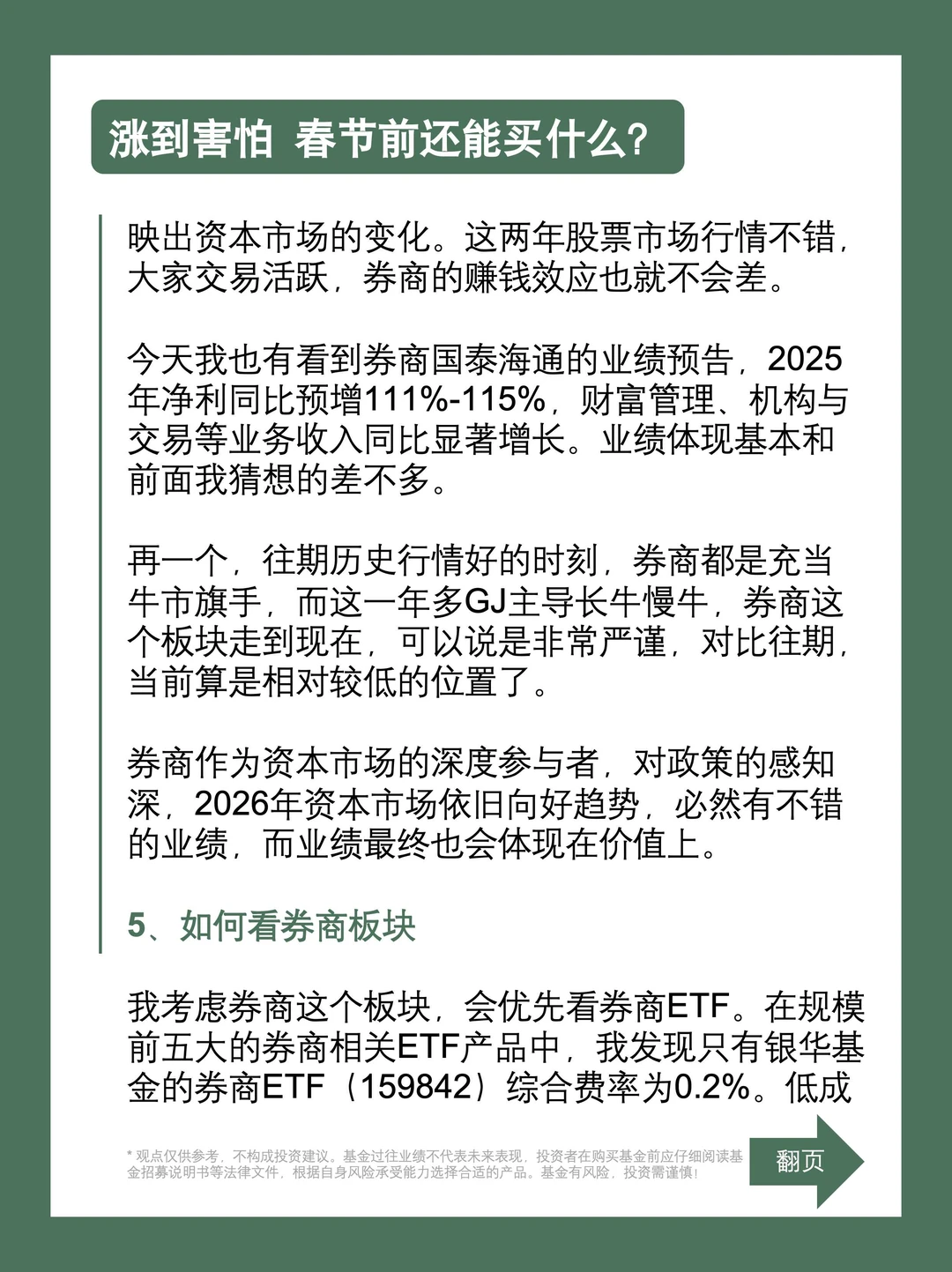 各个板块看下来,结合当前位置和综合价值,目前我可能会考虑证券这个板块。券商作为资本中介服务商,赚的是资本市场里相关业务的钱,且业绩的多个指标与资本市场挂钩,比如市场的股票成交额,两融余额等,在市场情绪变暖,风险信好提升时,券商的业绩能较快反映出资本市场的变化。这两年股票市场行情不错,大家交易活跃,券商的赚钱效应也就不会差。今天也有看到券商国泰海通的业绩预告,2025年净利同比预增111%-115%,财富管理、机构与交易等业务收入同比显著增长。业绩体现基本和前面我猜想的差不多。从历史行情看,券商都是充当牛市旗手,这一年多GJ主导长牛慢牛,券商这个板块走到现在非常严谨,当前是相对较低的位置,这个板块或是还不错的选择。