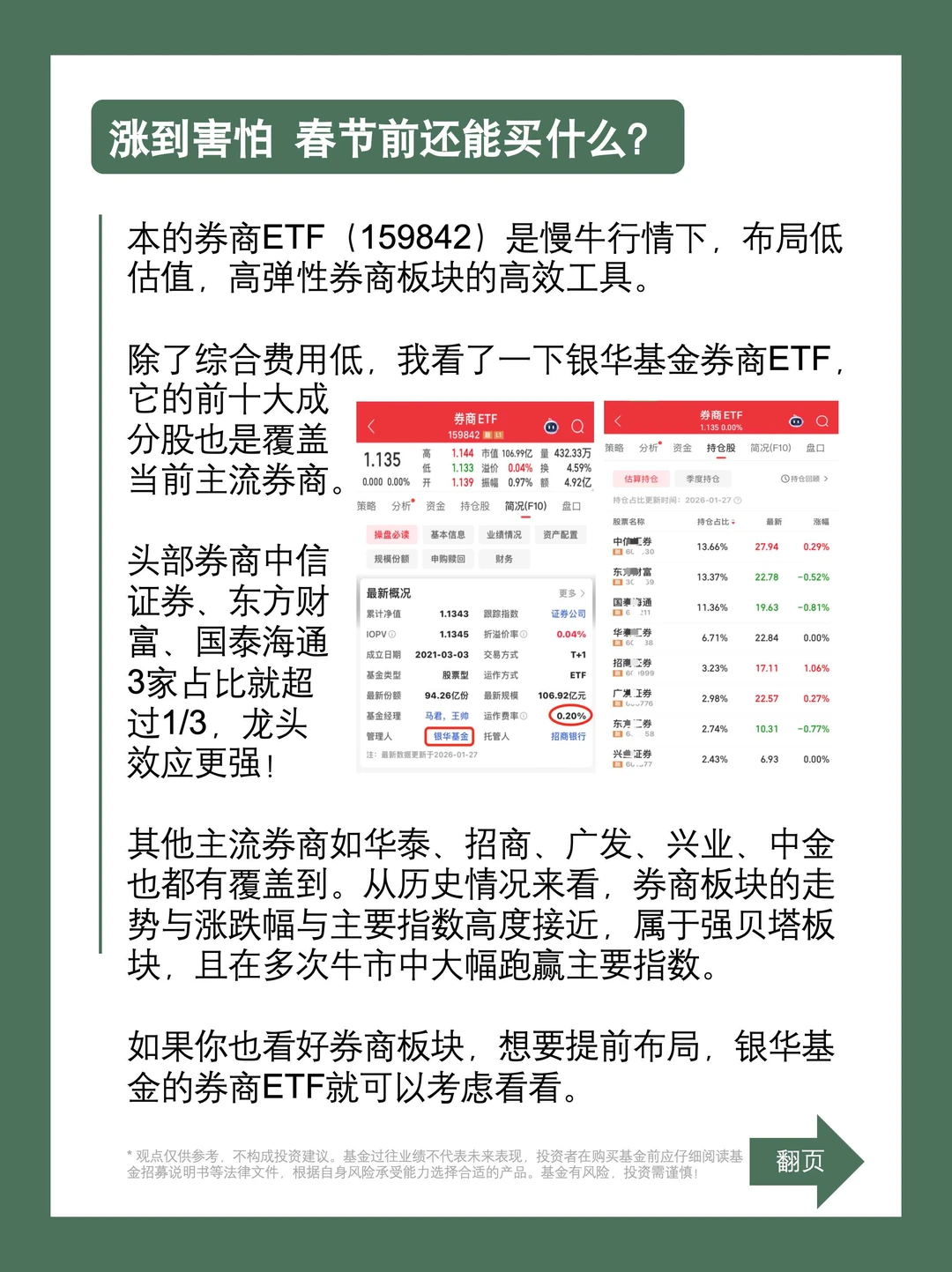 我考虑券商这个板块,会优先看券商ETF。在规模前五大的券商相关ETF产品中,我发现只有银华基金的券商ETF(159842)综合费率为0.2%。低成本的券商ETF是慢牛行情下,布局低估值,高弹性券商板块的高效工具。除了综合费用低,我看了一下它的前十大成分股头部券商中信证券、东方财富、国泰海通3家占比就超过1/3,龙头效应更强!如果你也看好券商板块,想要提前布局,银华基金的券商ETF就可以考虑看看。(基金有风险,投资需谨慎!)