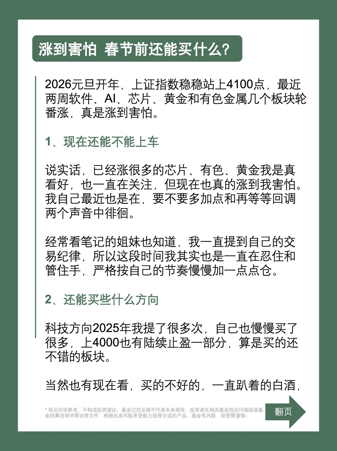 2026开年,上证指数稳稳站上4100点,近两周软件、AI、芯片、黄金和有色金属几个板块轮番涨,真是涨到害怕。