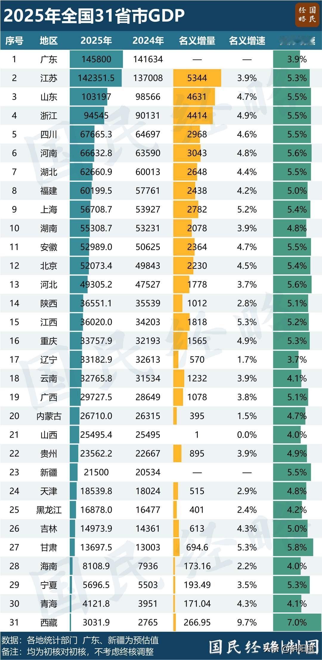 最新消息,各省市的GDP全部出炉! 十强省市的格局没有变化,粤苏鲁都站在了十万亿的高度,浙江估计还需两年左右时间才能晋级,但明显与其他6省市呈现断层式的领先! 四川河南这两个人口大省,一直是胶着的竞争,河南处于中部,竞争太过激烈。而西部的四川只有重庆,竞争自然小得多!河南短期内难以追赶!湖南与上海的差距翻倍了,直接从700亿干到1400亿。但湖南还是守住了十强,安徽这几年新产业已有了成效,但仍有2000多亿的差距,追赶仍有不小的压力。 江西一直被人诟病,但正在慢慢发力。江西与陕西的差距正在缩小,从去年的1300亿到今年500亿,超陕西已经指日可待了!没想到的是重庆反超辽宁,即便大连晋级万亿城市,但还是扭转不了下滑的趋势!重庆还是押中了汽车产业,让其得以快速发展! 最后再说下京爷和沪爷,这两个中国顶级城市,都是5万亿级别,可以说一市挑战很多省,未来差距还会持续拉大!