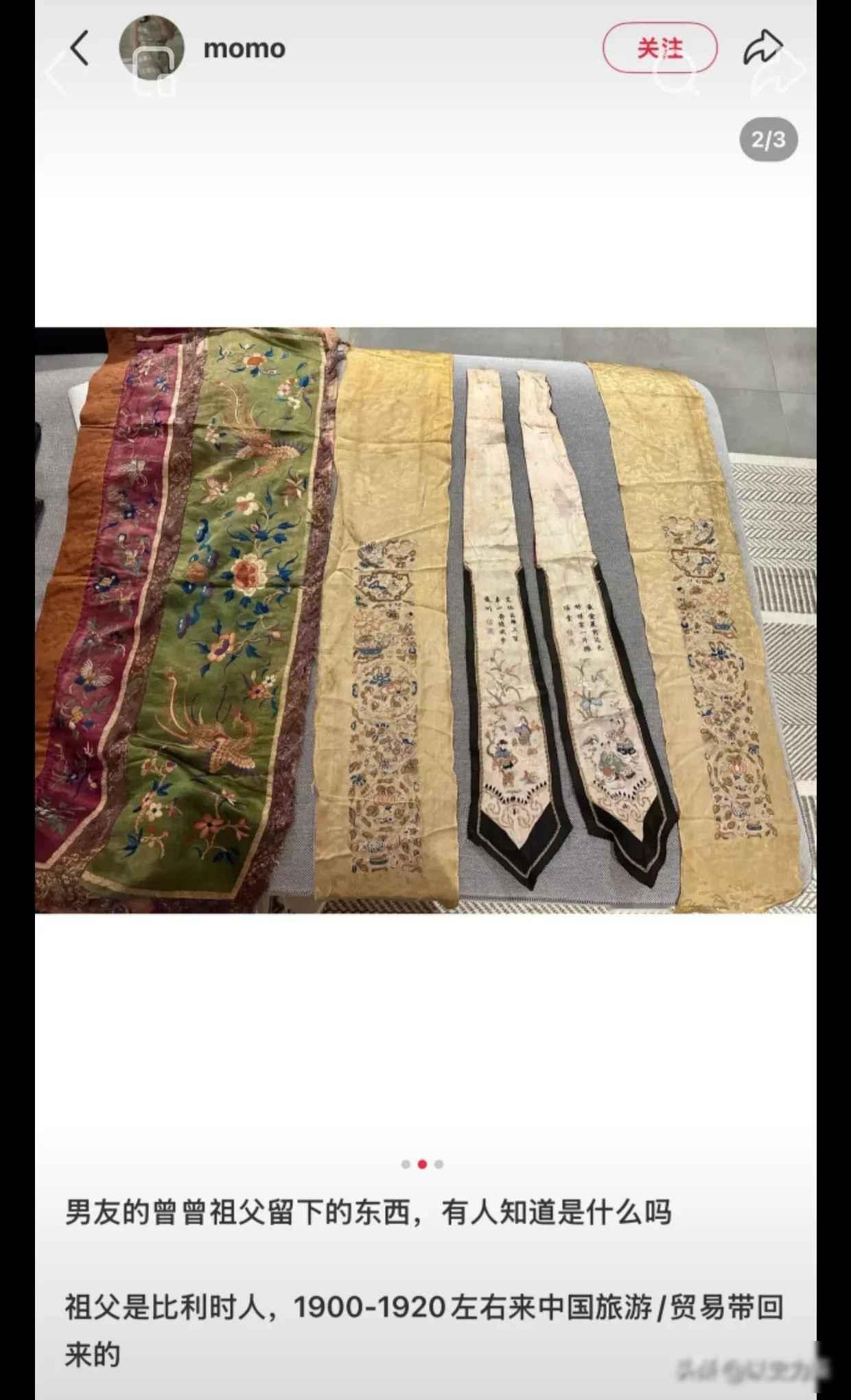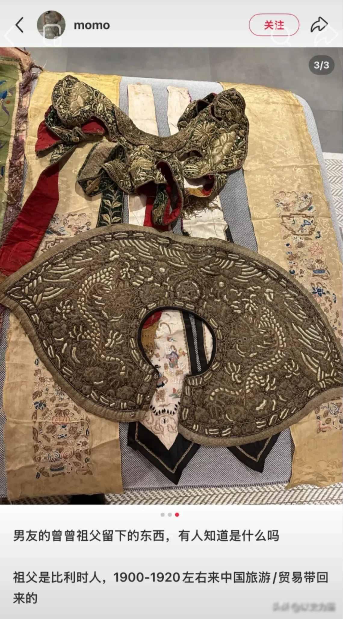 一个小hs女博主发帖炫耀她的比利时男朋友的曾曾祖父留下的东西,说是1900-1920年从中国旅游带回去的。结果被网友认出这是清代大婚时的喜服,上面还有斑斑血迹…… 一个二十出头的女孩在社交平台发了张照片,照片里是一件暗红绸缎衣,领口绣着金线牡丹,她说这是比利时男友家传的古董,祖上一百多年前来中国旅游时带回来的。 底下评论一下就炸了,有懂服饰的网友一看就认出来,这压根不是什么旅游纪念品,是清朝当官人家才穿得起的婚服,衣角还沾着干掉的褐色印子,看着像血迹。 事情传得挺快,后来有爱翻旧账的人翻出资料。 那会儿正好是八国联军打到北京的时候,有人猜这衣服大概是从哪场婚礼上抢的,说不定那对新人就死在自家院里,衣服被人一刀割下来当了战利品。 比利时那边的家族里倒是有过说法,说曾祖父跟着军队去过中国,可到底咋回事,早没人说得清了。 最让人不舒服的是博主的态度,她好像根本没觉得有什么不对,还问这种老古董到底有啥研究价值,底下不少人气得直接骂她血衣还敢晒。 后来她删了帖子,可截图早传开了,有网友顺着线索一查,发现她随手标那句诗根本不对,原句是笑他英雄三百辈,一起随我步瀛洲,出自晚清秋瑾的词,跟婚礼一点关系都没有。 这事闹到现在,不少人开始翻比利时那户人家的底细,有人说他们祖上是联军的,有人说那件衣服的绣法跟山西某个家族的一样,一件旧衣服,牵出百年来的争执。 最让人心里不是滋味的,是一百多年了,当年动手的人的后人还把那东西当宝贝显摆,而被欺负的人的后人,翻遍了书本和档案,也只能靠着一块带血的绸子,一点点拼出当年的事。