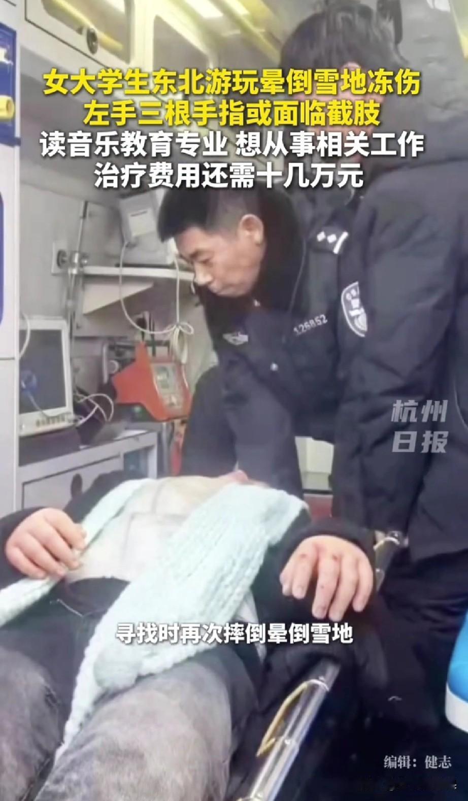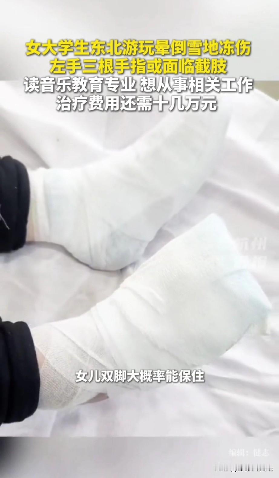 谁能想到,一场满心期待的东北雪旅,会变成一场噩梦。这个21岁的四川女大学生小陈,只是下车找个手机的功夫,就不小心滑倒摔晕在零下二十多度的雪地里。零下二十多度的低温,可不是闹着玩的,等被人发现时,她的手脚已经冻得发黑,想想都觉得心疼。 送到医院后,医生的诊断更是让人揪心:三度、四度冻伤,双脚拼尽全力勉强能保住,可左手三根手指大概率要截肢。好好的姑娘,正是最美的年纪,却要面临这样的遭遇,而后续的治疗和康复费用,更是让本就普通的家庭雪上加霜。看着孩子父亲在筹款平台上的求助,一字一句都是无奈,所幸目前已有2300多位好心人伸出了援手,这份温暖也算给这个家庭添了点力量。 说真的,我看到这个消息时,第一反应是惋惜,再就是后怕。很多南方朋友和小陈一样,对东北的雪充满向往,却容易低估北方的极寒天气,总觉得穿厚点就行,却忽略了低温下任何一个小意外,都可能酿成无法挽回的后果。零下二十多度的户外,失去意识哪怕只是几分钟,身体都可能遭受不可逆的伤害,这真的不是危言耸听。 冬日去北方看雪,是浪漫的选择,但浪漫的前提,一定是保护好自己。在此也想跟所有冬日出游北方的朋友说几句掏心窝的话: ❶ 保暖装备别嫌麻烦,手套、帽子、防滑鞋、厚围巾,该带的一样都别少,这都是保命的东西; ❷ 北方的雪地冰面特别滑,走路出行多留意脚下,一旦摔倒身体不适,千万别硬撑,立刻找温暖的地方躲避,及时求助; ❸ 出门在外,尤其是去陌生的寒冷地区,千万别单独行动,结伴而行,互相有个照应,能避免很多意外。 真的希望小陈能熬过这道难关,希望医生能有更多办法,让她少受点罪。也愿所有奔赴冬日美好风景的朋友,都能把安全放在第一位,平安出发,平安归来,别让一场美好旅行,变成一生的遗憾🙏