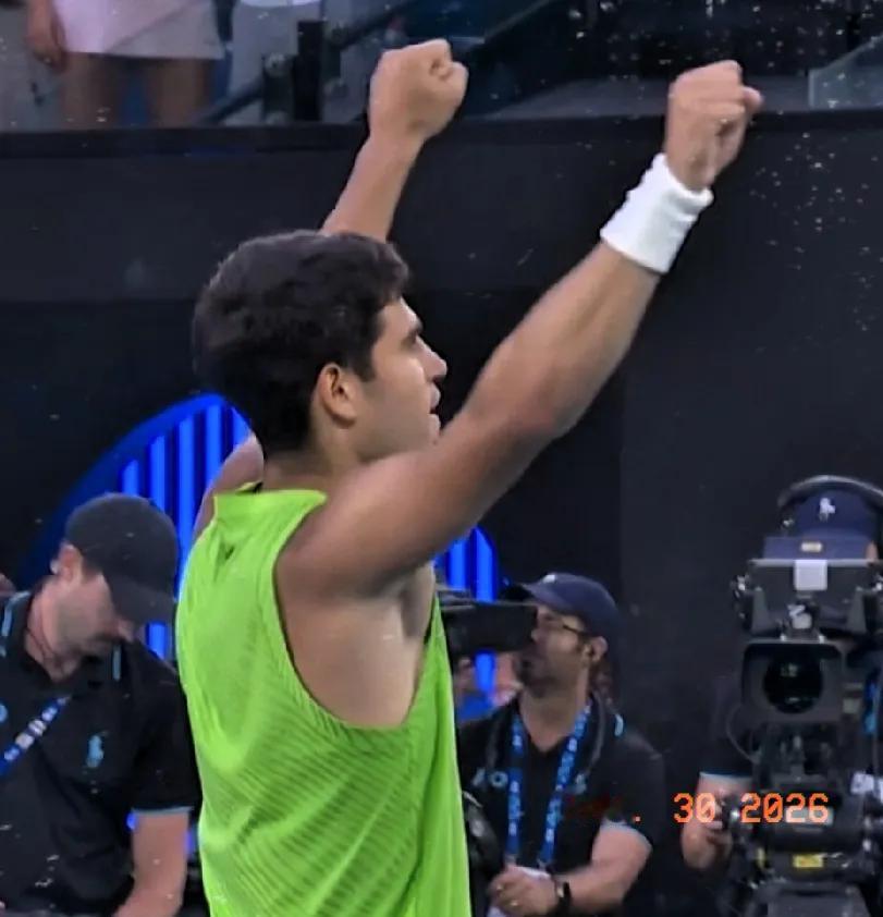 阿卡赢了!决胜盘7-5单局超级大逆转胜出。 2026澳网男单第一场半决赛,耗时5个半小时,阿尔卡拉斯苦战过关,以总分3~2赢下了澳网半决赛这场惊心动魄的五盘大战。 大比分2-0领先,被兹韦列夫连板二盘追平,决胜盘兹韦烈夫首局破发,将领先优势一直保恃到盘尾5-4。阿卡被逼到了毫无退路的绝境中。 关键时刻,阿尔卡拉斯咬紧牙关,顶住压力,绝地反击,连胜3局,一举拿下全场比赛胜利! 带伤征战,如此艰难战胜强敌,闯入决赛,登顶争冠。阿卡整场比赛展示的顽强拼搏精神,真令世人叹为观止。