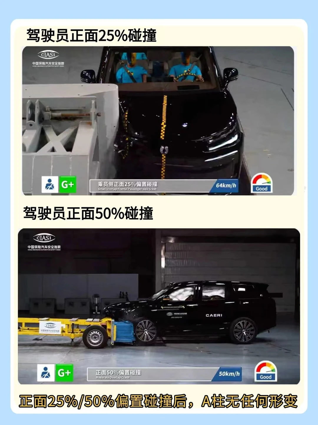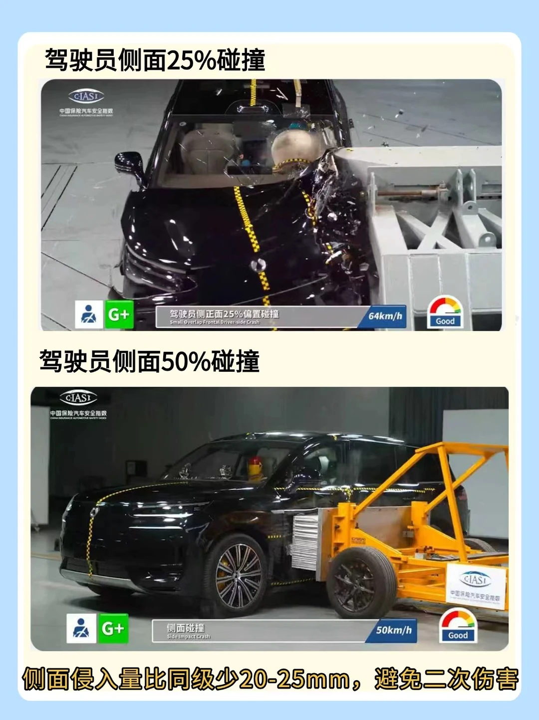 ✅ 车内乘员安全G+(25%偏置碰撞A柱零形变,侧面碰撞车门侵入量超优秀)