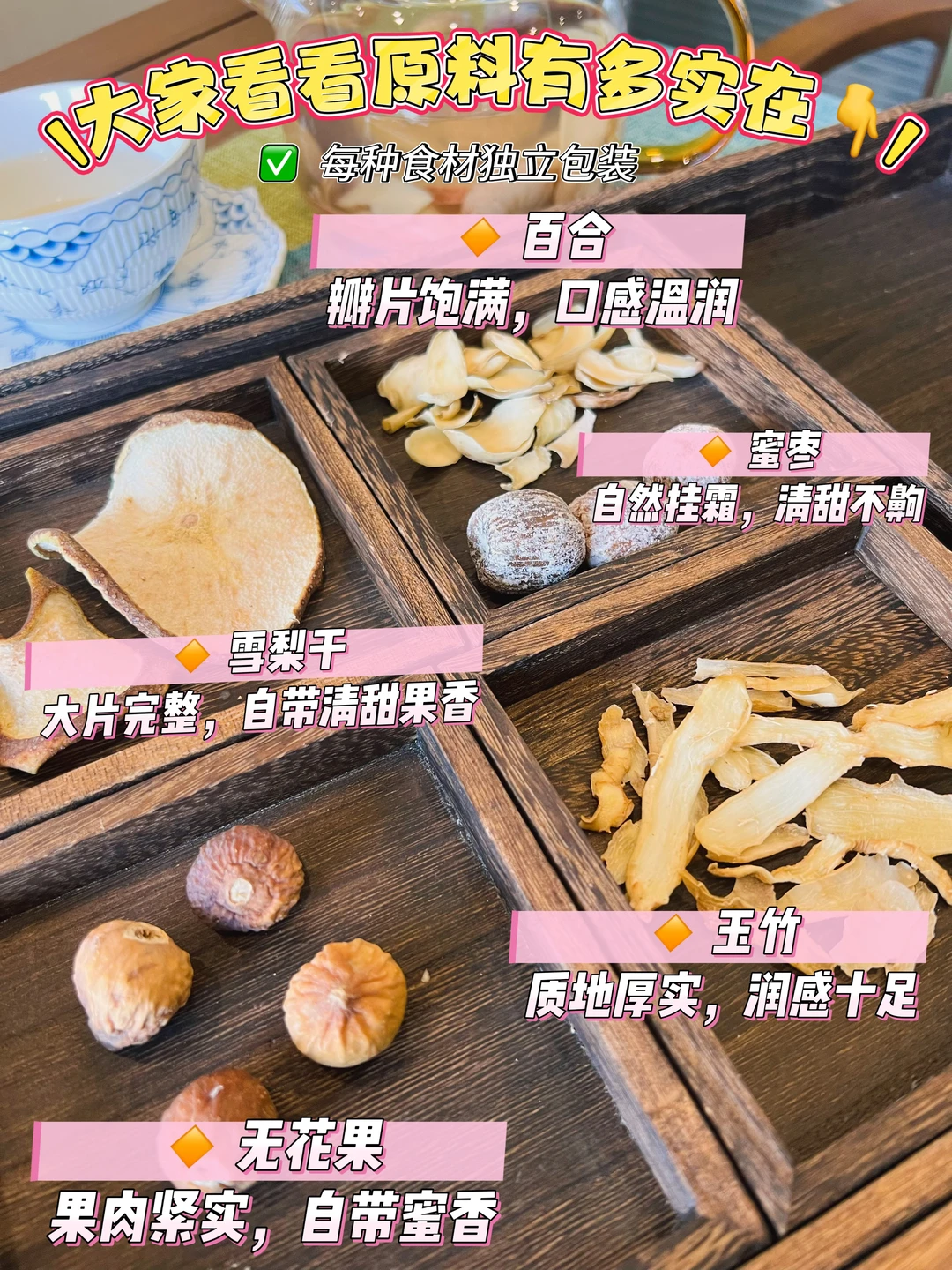 谁懂干燥季节真的离不开温润甜汤 不爱喝寡淡白开水,又怕奶茶甜品太腻 这款百合雪梨汤包直接承包我整个秋冬的快乐 肉眼可见的真材实料✨ 雪梨干、百合、玉竹、无花果、蜜枣 每一味食材都是独立小包装 干净卫生不串味,不用自己配比称量 厨房小白、懒人党直接丢进养生壶/锅里 加水煮20分钟就能喝,清甜不齁,润润的超舒服 待空调房久了口鼻干干的 熬夜后嘴巴发涩、不爱喝水的小朋友 重口火锅烧烤后来一杯解腻爽口 配料只有天然食材,无额外添加 老人小孩都能放心喝,全家共享的日常温润好物