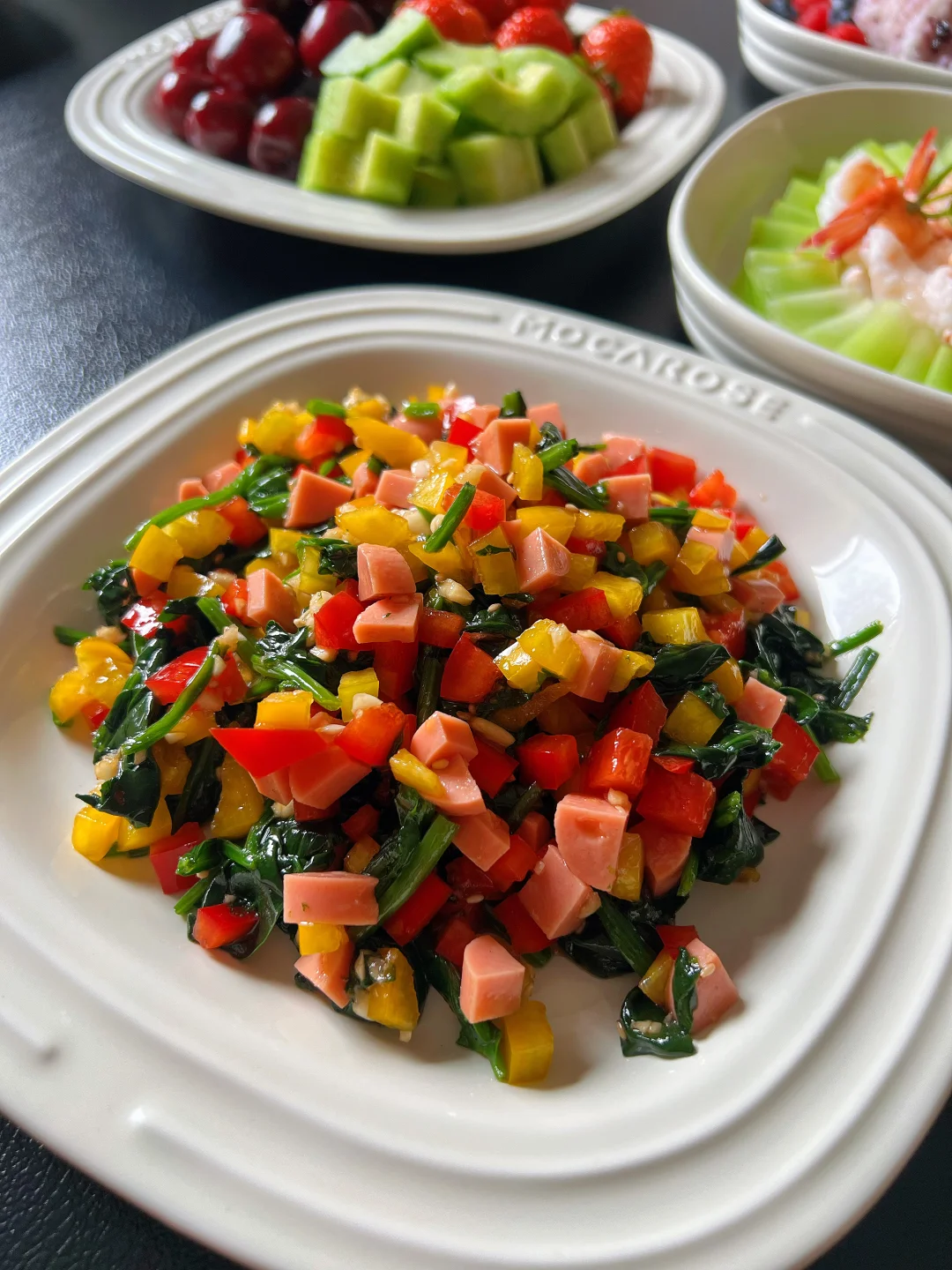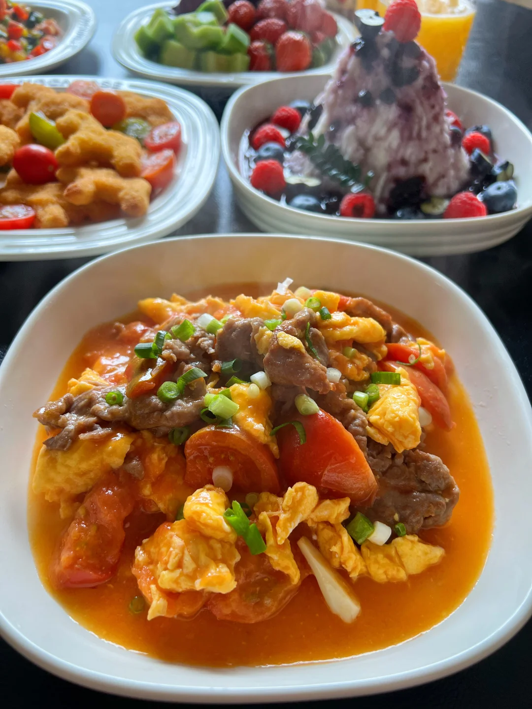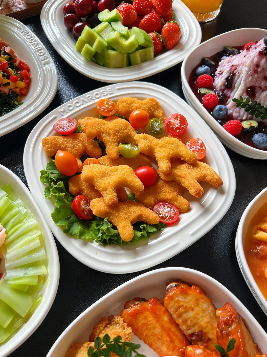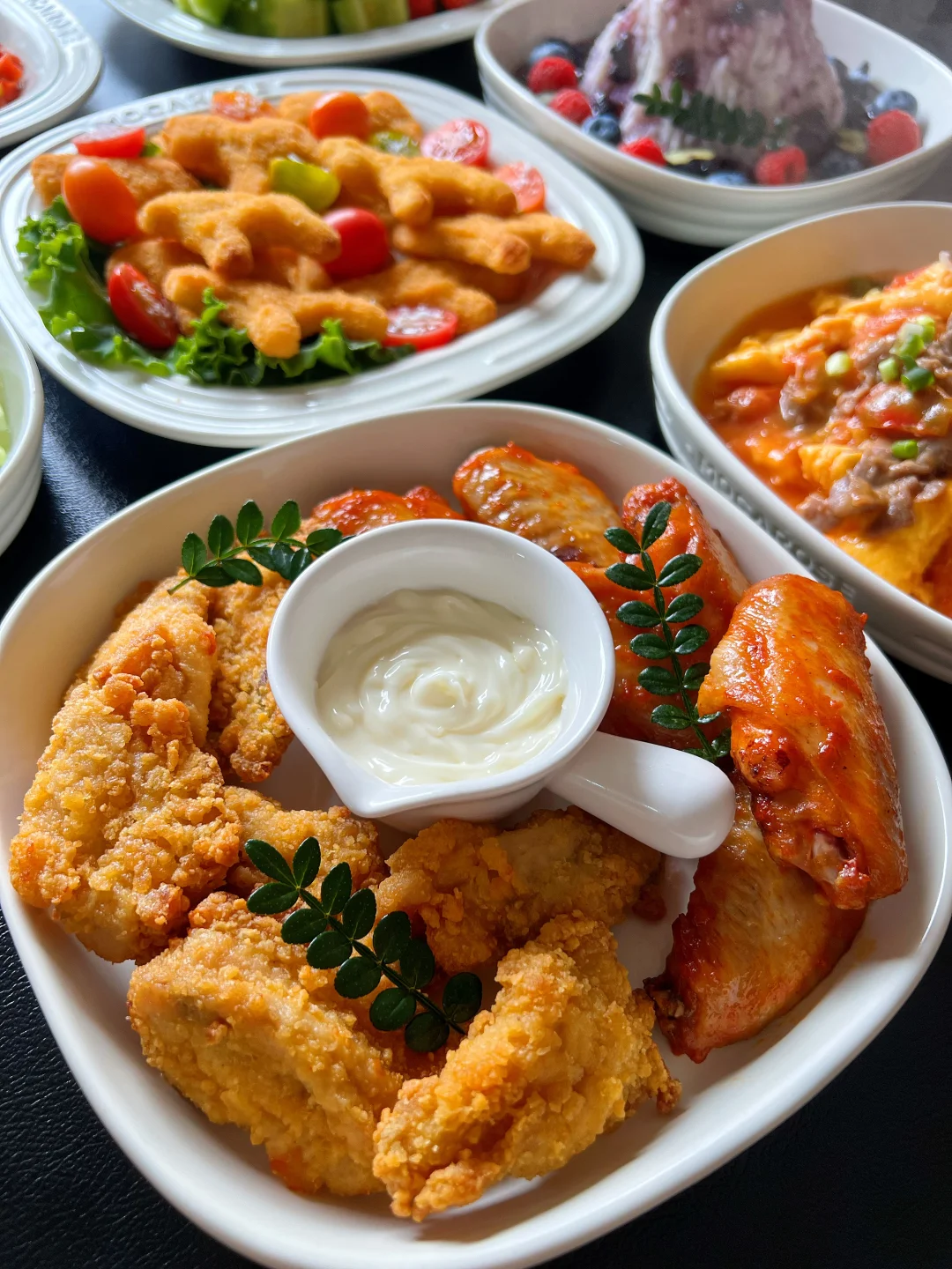 1⃣️小马奶酪鸡块 2⃣️炸鸡拼盘 3⃣️蓝莓山药泥 4⃣️番茄牛肉滑蛋 5⃣️八宝菠菜 6⃣️莴笋虾片