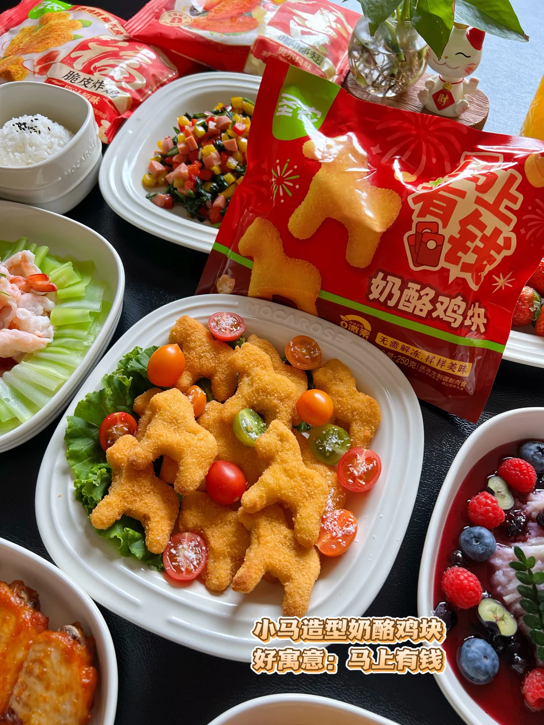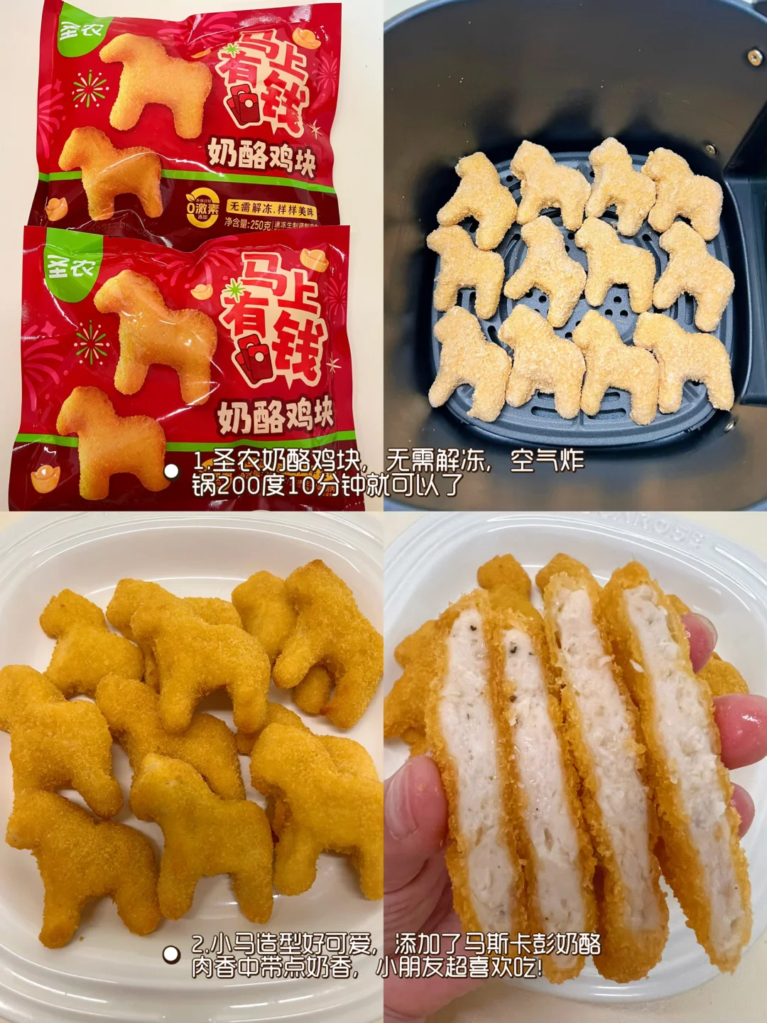 [星R][星R]今天的 C位菜,是圣农的「马上有钱」奶酪鸡块!萌趣的生肖小马造型非常可爱[派对R],酥脆的外皮加浓郁的奶酪口味,小朋友喜欢的不得了~