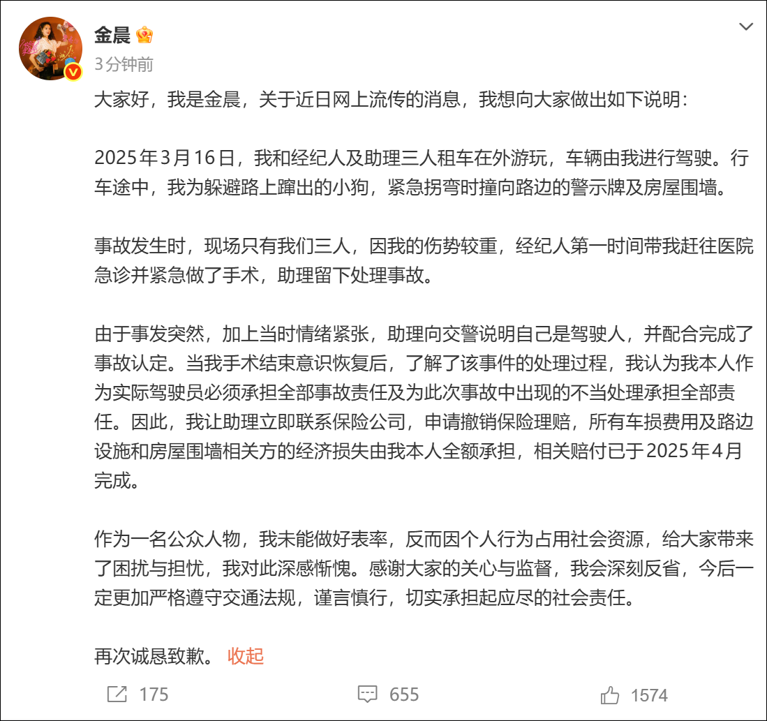 通报发布后,金晨在个人社交账号发文道歉:
