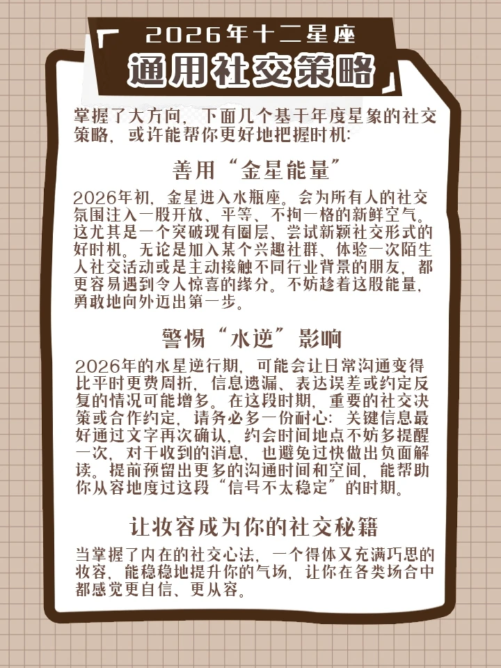 希望这份指南能帮助十二星座的朋友们在2026年的社交场合中更加从容自信。也祝你们在新的一年,在人群中既能闪耀自我,也能收获真挚的联结!