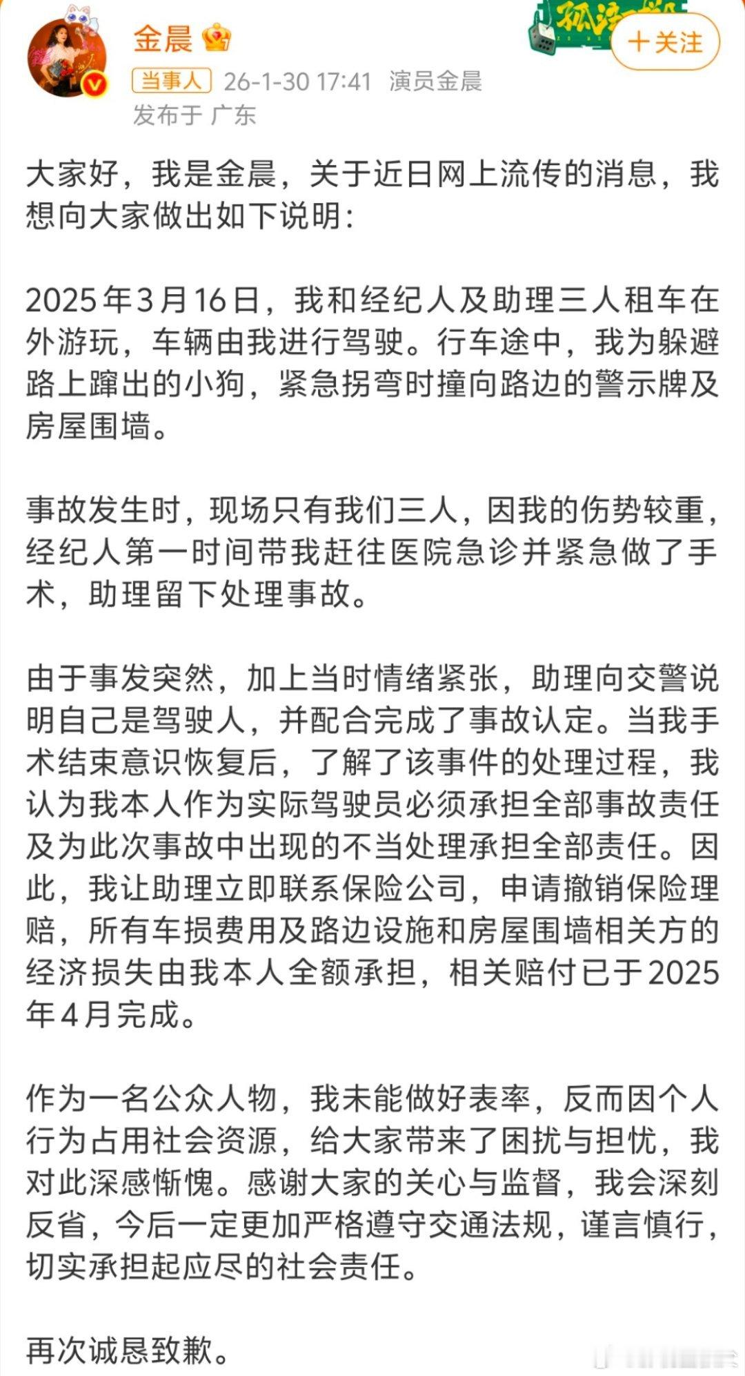 警方通报金晨事件警方对金晨事件进行陈述并表示有关问题还要进一步核查,金晨也发博对自己的行为表示歉意并表明相关赔付于2025年4月完成,并在评论区发布了她当时受伤的照片