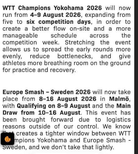 瑞典大满贯将与横滨冠军赛无缝衔接原瑞典大满贯时间是8月13日-8月23日现在调整成8月8日-8月16日这样调整后会和WTT横滨冠军赛(8/4-8/9)无缝衔接