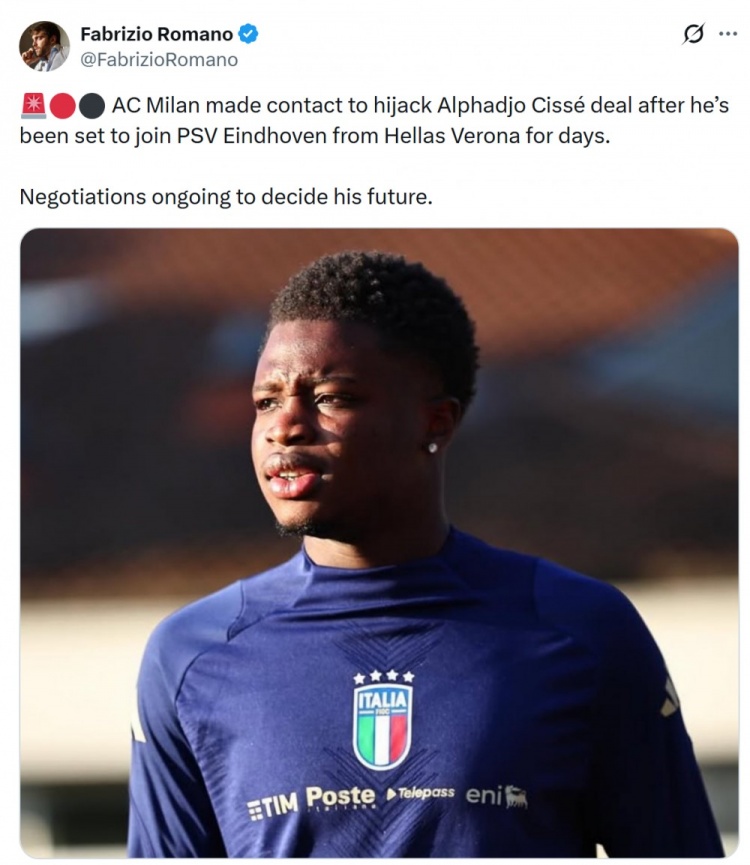 直播吧1月30日讯据知名记者罗马诺报道,米兰尝试从埃因霍温手中截胡维罗纳中场阿尔法乔·西塞。