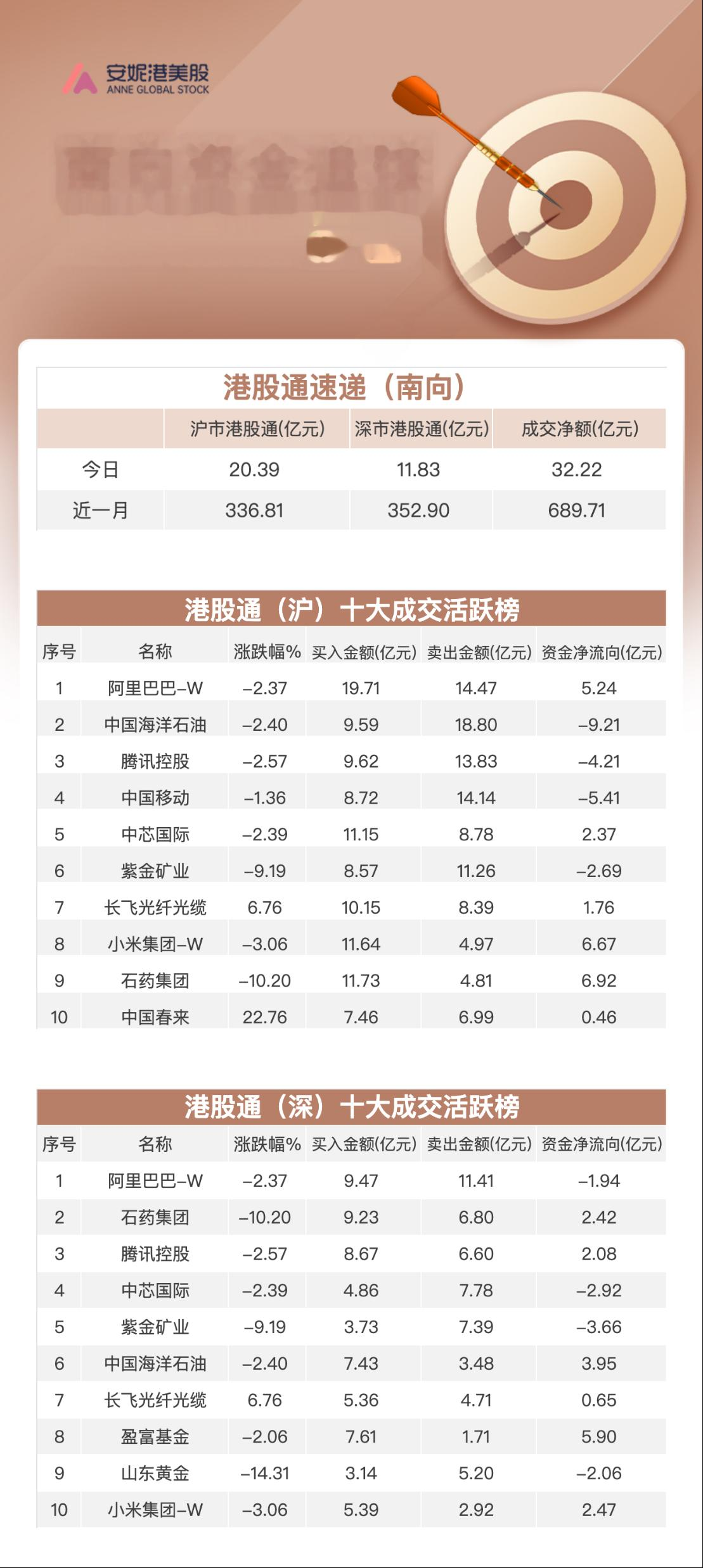 大幅净卖出:中国移动(00941.HK)169.68亿港元;紫金矿业(02899.HK)45.65亿港元。