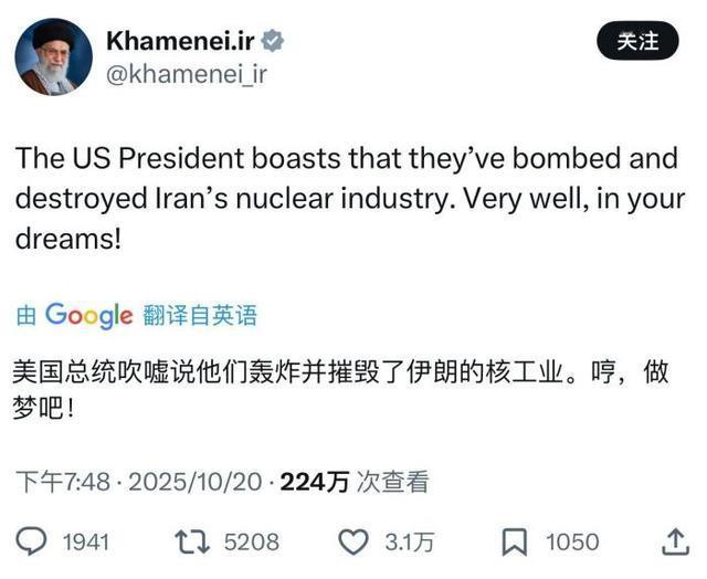 2025年10月20日,针对特朗普提出的重启伊核谈判提议,以及“美国已摧毁伊朗核能力”的言论,伊朗最高领袖哈梅内伊毫不客气地回怼:“Verywell,inyourdreams!”