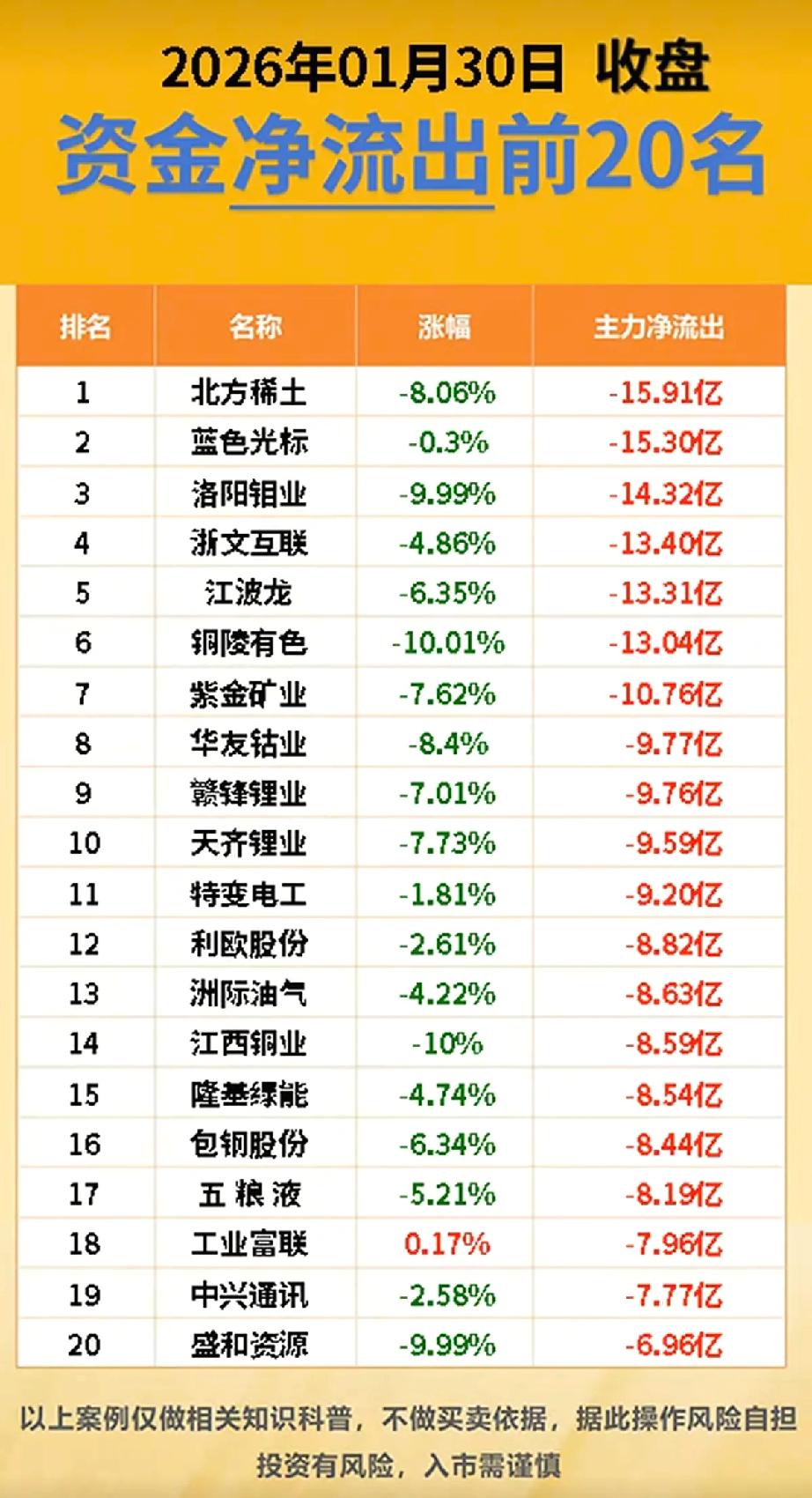 1月30日,周五A股主力资金净流入流出一览表!!! 今日,中际旭创主力资金大幅抢筹18.2亿,后市值得高看一眼;新易盛主力资金大幅抢筹17.25亿,后市值得期待;北方稀土主力资金大幅流出15.91亿,后市需注意风险!!!