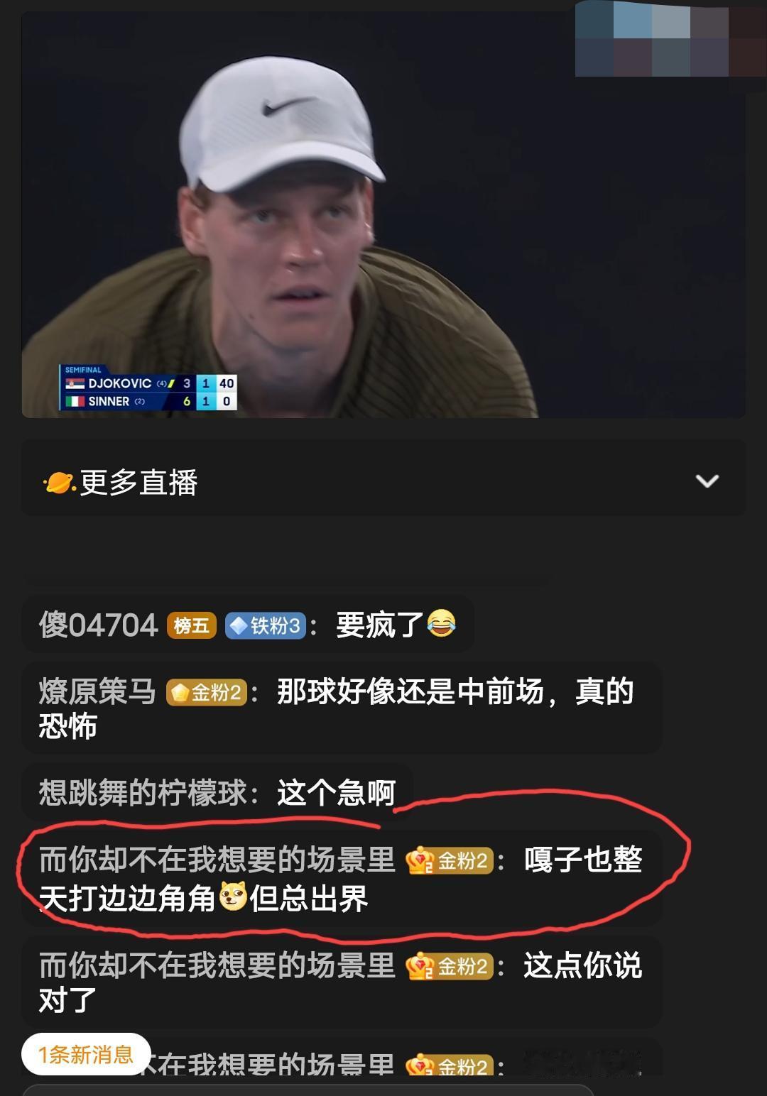 德约和辛纳这场澳网男单半决赛的直播间,评论区居然都是讨论女球员的话题“哪个女球员的打法更像辛纳”。这是有多瞧不起德约啊,觉得德约肯定输?男球员和女球员的打法如何放到一起评价? 自从郑钦文奥运夺冠之后,国内就多了一批喜欢扯闲篇的所谓“网球迷”,她们从来不关注比赛本身,更多的喜欢给球员起绰号,球员的衣服鞋子好不好看等等。这不,今天没什么话题可聊了,她们又煞有介事的在那里扯辛纳的打法。斯瓦泰克、萨巴伦卡、莱巴的打法哪一个更像辛纳的打法?我全场看下来,没一个说中要点的。 我猜这里面大部分是女性球迷!