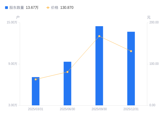 日期A股户数(户)流通A股户均持股数(股)户均持股市值(万元)2025-12-311366534380.8457.332025-09-301447254136.5069.132025-06-30931826423.8851.822025-03-31709458326.7252.192024-12-31774145262.3534.822024-09-30507717970.1642.112024-06-303662011037.6927.722024-03-313898110368.7831.272023-12-313826910561.0243.892023-09-30446739045.7738.75
