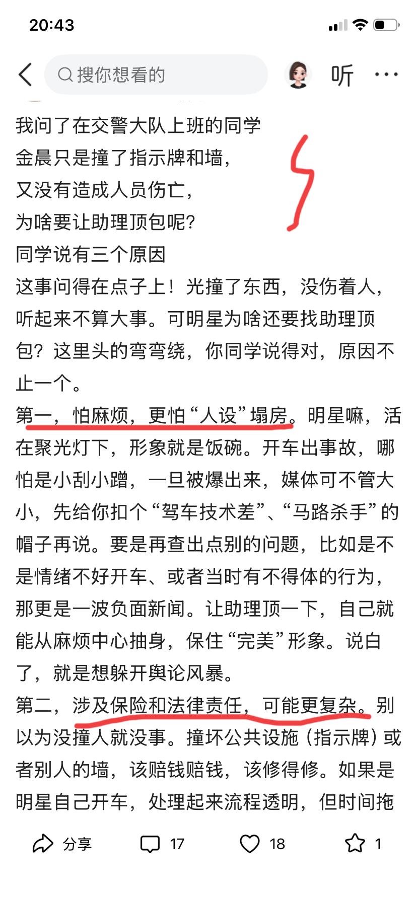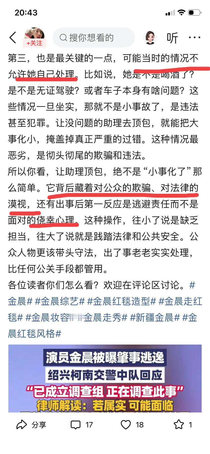 女星金晨肇事逃逸? 满脸鲜血,毁容了吗? 没想到这一新闻来的猝不及防 肇事逃逸? 我觉得不太可能, 毕竟明星那么有钱! 再说事故现场是单车事故 没必要逃啊! 不过纳闷的是 金晨脸部受伤急着去医院 留助理处理 助理为何要说谎呢? 谎称是自己的责任! 金晨应该就是急着护脸 离开了现场 毕竟怕毁容嘛