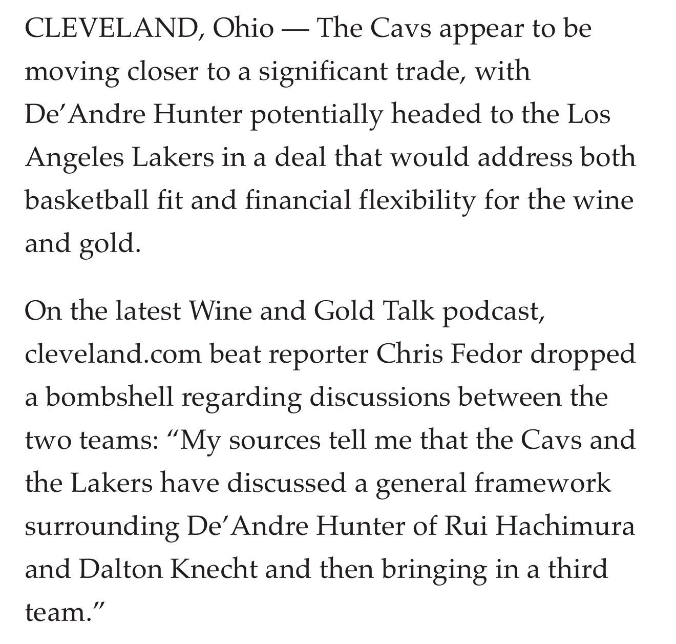 骑士记者Chris Fedor:据我的消息源透露,骑士队和湖人队已经讨论了一个初步框架,核心是用亨特换取八村塁和克内克特,并会引入第三方球队来完成交易。