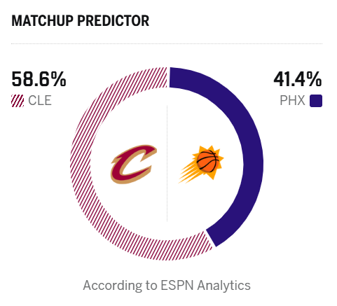 ESPN预测明日比赛:骑士胜率58.6%,太阳胜率41.4%