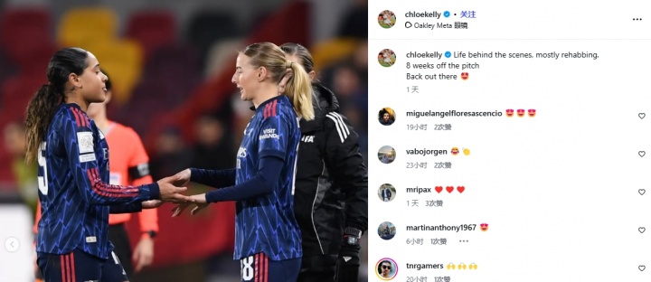 阿森纳女足球员凯莉社媒晒康复照:远离赛场8周,我将重返球场