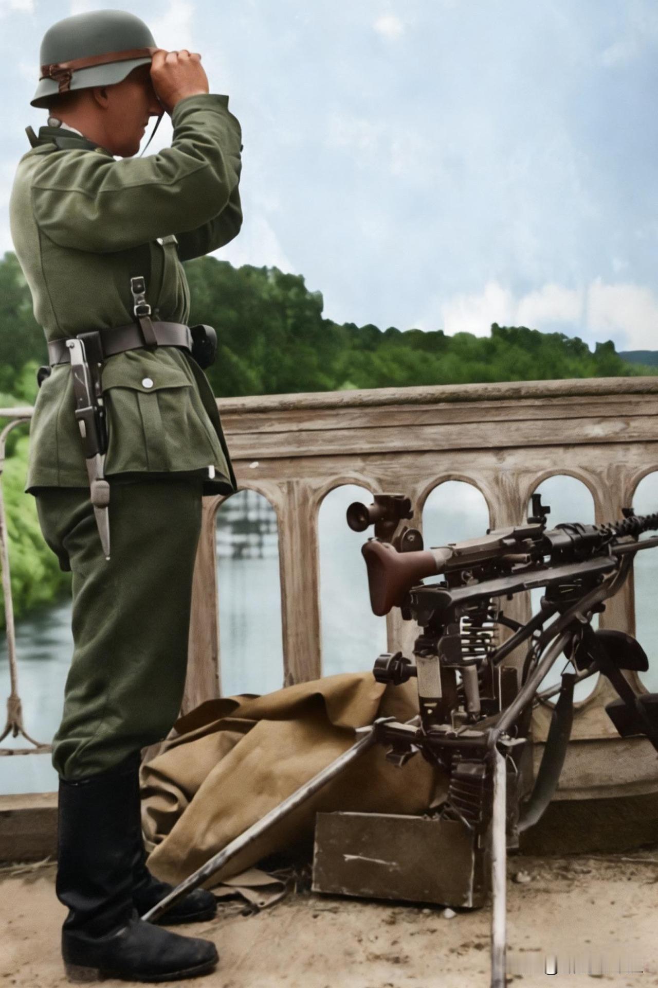 一名德军机枪手在一座桥梁上警戒,他手握望远镜,专注地观察着远方的动静。在他旁边是