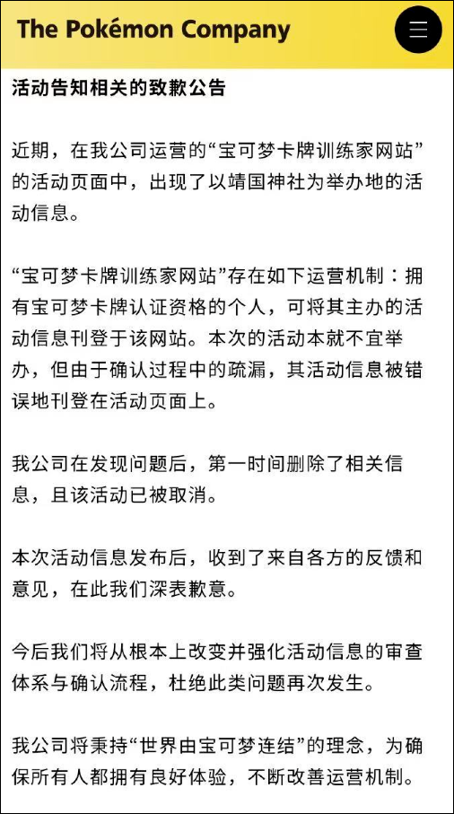 近期,在我公司运营的“宝可梦卡牌训练家网站”的活动页面中,出现了以靖国神社为举办地的活动信息。