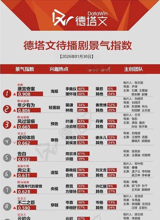 王星越德塔文待播剧指数连续两天前五占二,什么水平?已知唐宫快定档了,但是告白都还