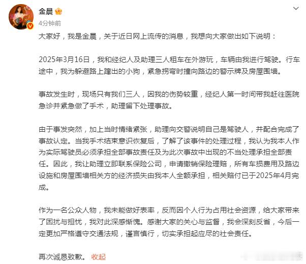 金晨道歉金晨回应 刚刚,发文回应被曝肇事逃逸:“2025年3月16日,我和经纪人及助理三人租车在外游玩,车辆由我进行驾驶。行车途中,我为躲避路上蹿出的小狗,紧急拐弯时撞向路边的警示牌及房屋围墙。