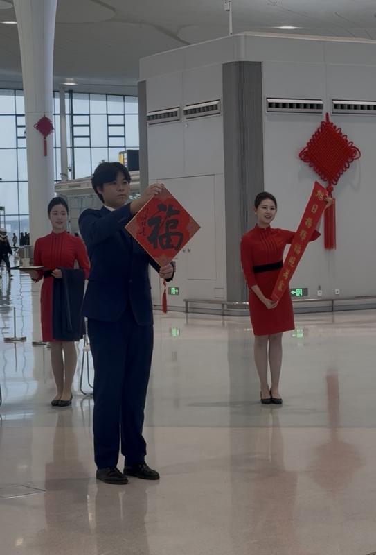 “没想到,杭州的机场还挺有过年的氛围。”湖南来杭出差的顾先生拍了视频、收到了福字,笑得合不拢嘴,“舞蹈挺有意思的,我已经发到家庭群了,侄女说以后要当空姐,刚好可以看看。”