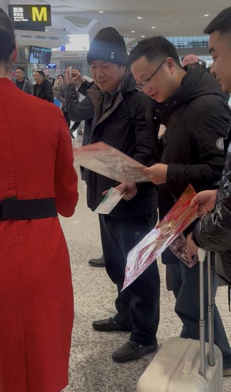 现场,数十位来自浙江旅游职业学院空中乘务专业的青年学子,身着精心设计的制服,以优雅专业的仪态从旅客中走出,迅速集结成队。他们带来了融合航空服务礼仪展示、新春祝福舞蹈及马年元素创意表演的精彩快闪。学生标准规范的客舱服务手势、亲切温暖的微笑、充满朝气的舞步,生动演绎了民航服务的专业与温度。活动合作方之一的埃及航空公司代表也参与互动,增添了国际化的合作氛围,吸引了许多旅客纷纷驻足欣赏、拍照记录,并报以热烈掌声。学生还手持春联、福字向旅客送上新春祝福。