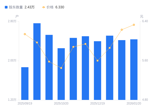 日期A股户数(户)流通A股户均持股数(股)户均持股市值(万元)2026-01-202434024580.0215.562026-01-092417724745.7315.422025-12-312508923846.2113.972025-12-192395224978.1913.992025-12-102497723953.1414.232025-11-202463924281.7314.282025-10-202252926555.8914.472025-10-102524623697.9213.222025-09-302761721663.3812.932025-09-191866432055.1619.68