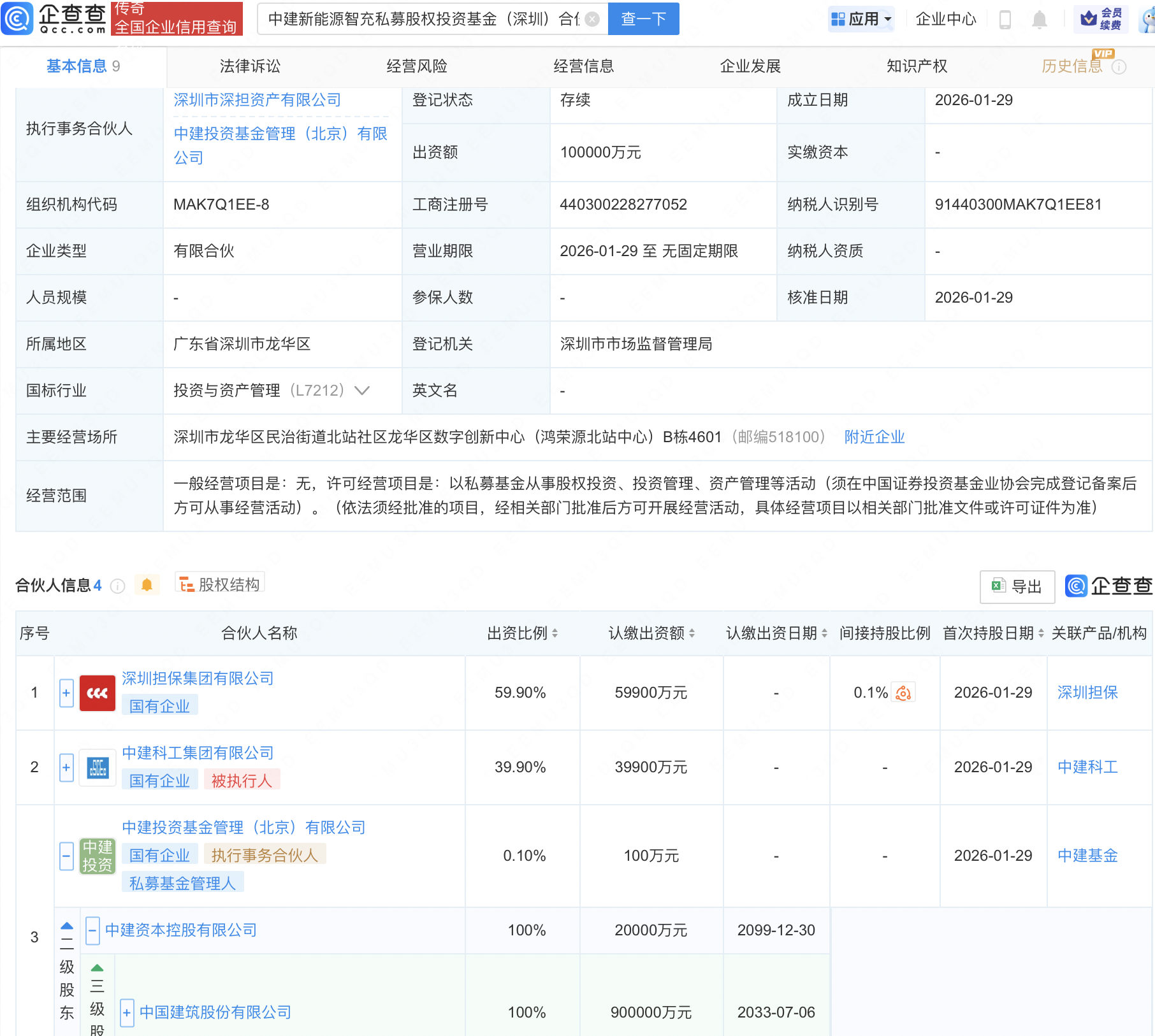 企查查APP显示,近日,中建新能源智充私募股权投资基金(深圳)合伙企业(有限合伙)成立,出资额10亿元,经营范围包含:以私募基金从事股权投资、投资管理、资产管理等活动。企查查股权穿透显示,该企业由深圳担保集团有限公司、中国建筑(601668)旗下中建投资基金管理(北京)有限公司等共同出资。